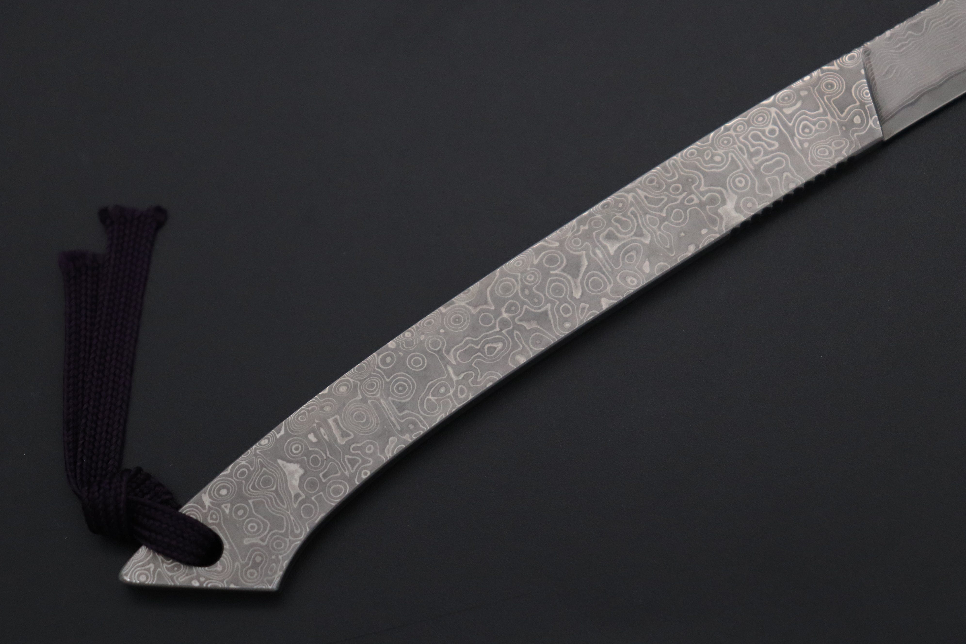 Each hand forged blade has a core layer of Cowry X and outer layers of Nickel-Stainless Damascus (SUS440 steel). Cowry X is a tough Powdered Metallurgy tool steel that was specially developed by Daido Steel Company for high-performance cutting tools. It contains a high volume of Carbon (3%) and Chromium (20%), some Molybdenum (1%) and a little Vanadium (0.3%).