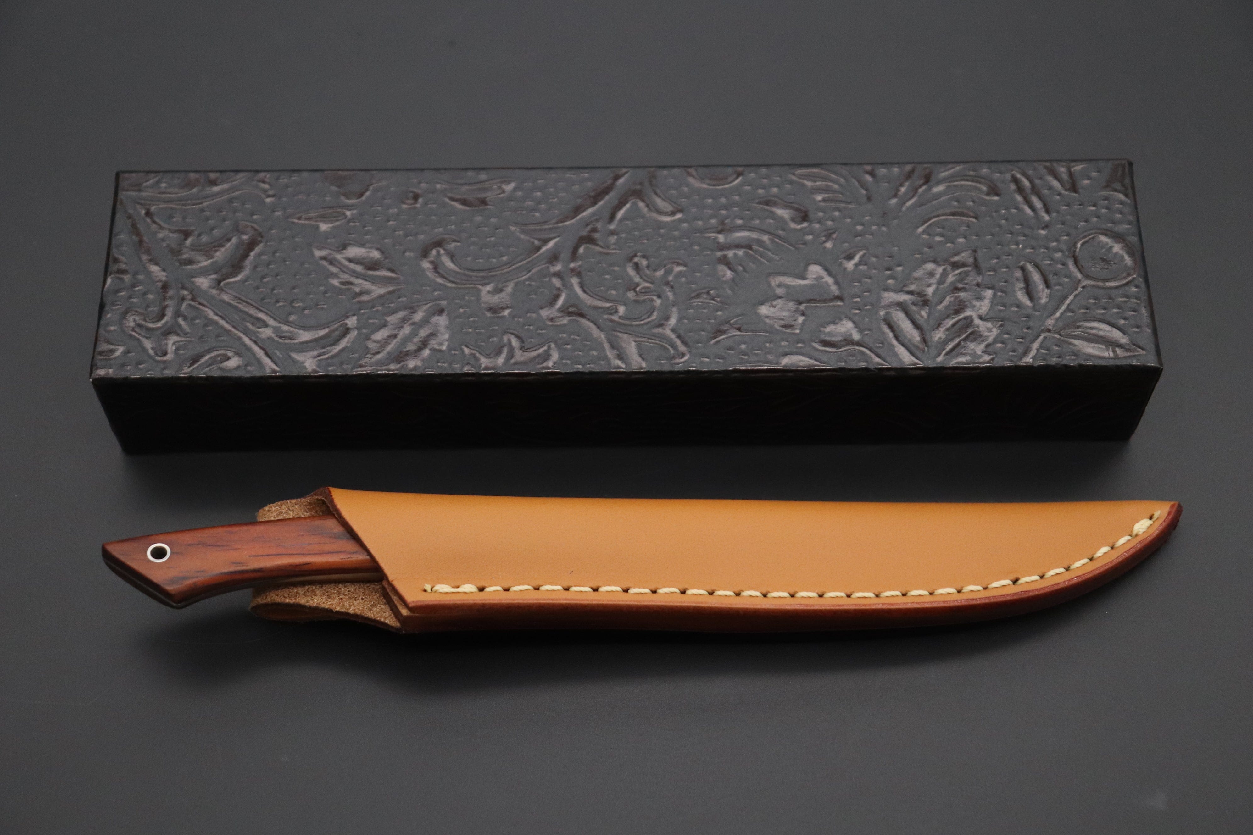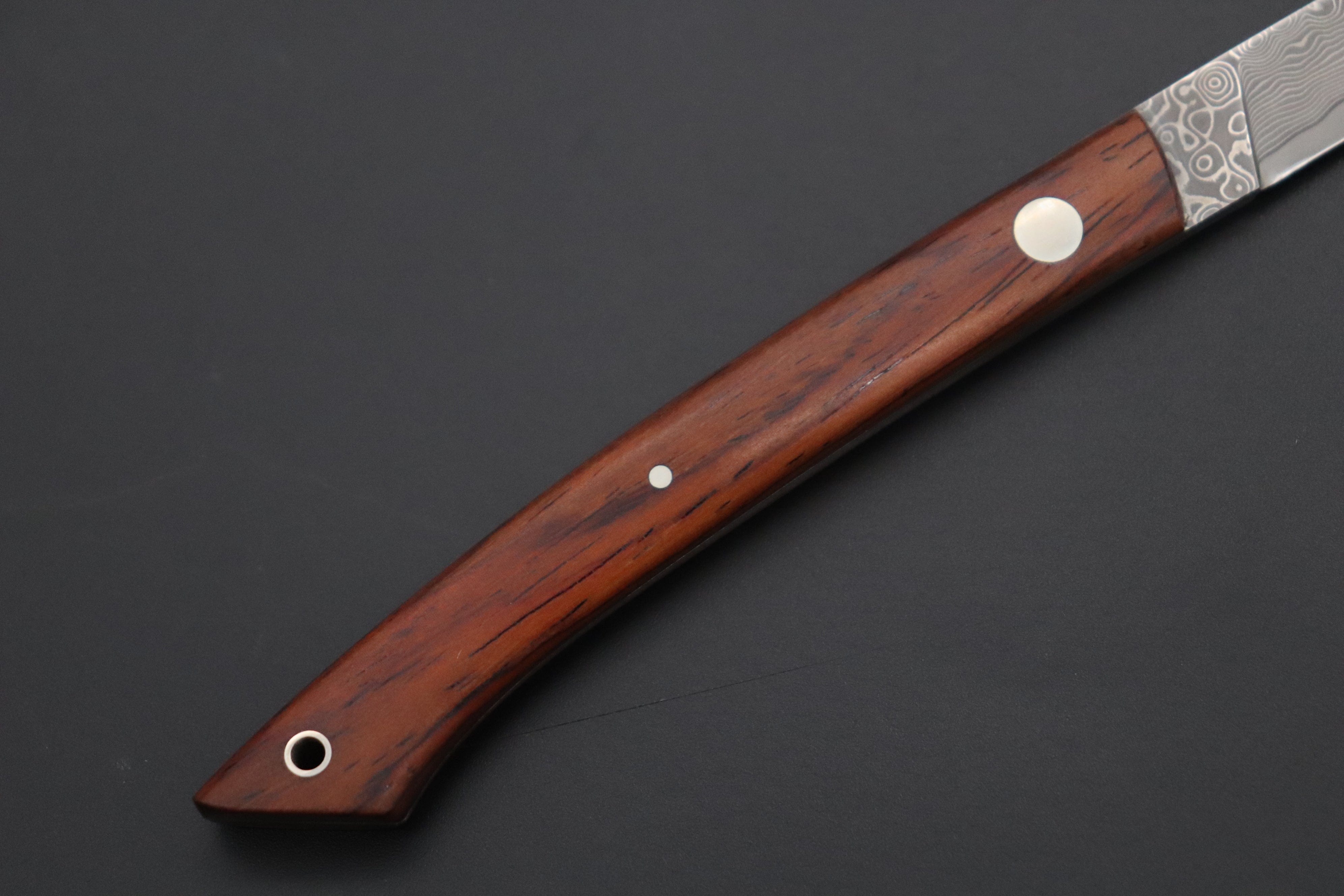 Scalpel style Utility knife with slim 3-1/4" Cowry-X core forge layered Nickel/Stainless Damascus steel blade. 4-inch Ebony wood handle. Tapered full tang fastened with large nickel silver rivet, small pin and lanyard hole tubuler. Comes with brown leather sheath