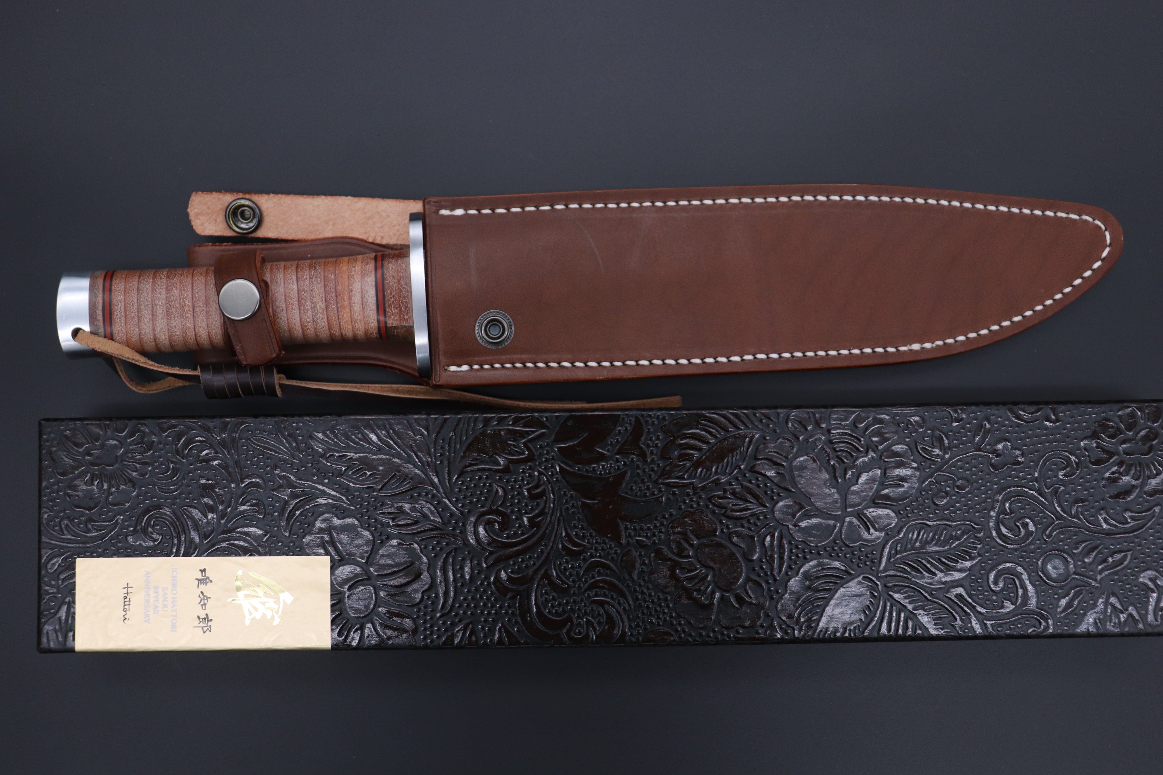 The Leather Washer Handle has been etched with both the GECKO Trade Mark logo and comes with a special Gift Box, which is decorated with a special Sanjyu ("80-year anniversary") gold label and contains a commemorative message from Master Hattori. A hand-stitched leather sheath with belt loop and Hattori GECKO Original Certificate are also included. This knife collection is produced and available for only 2Pcs.