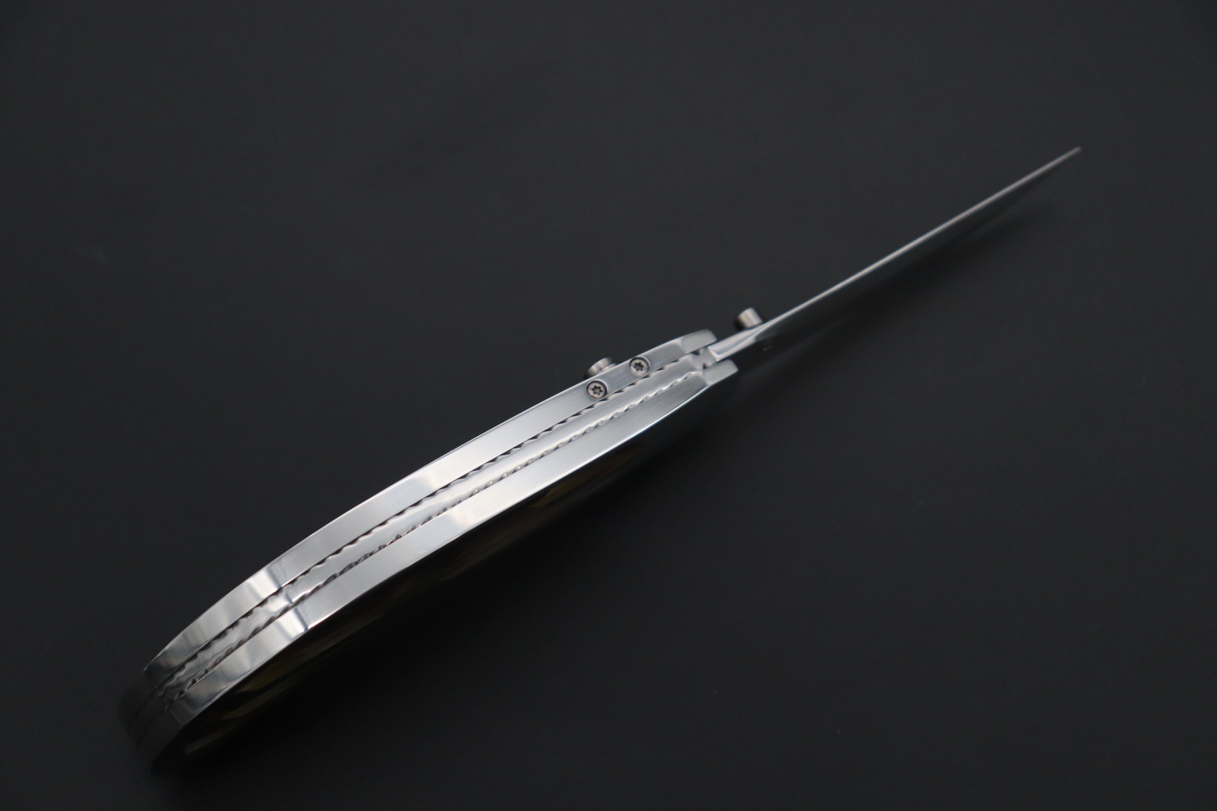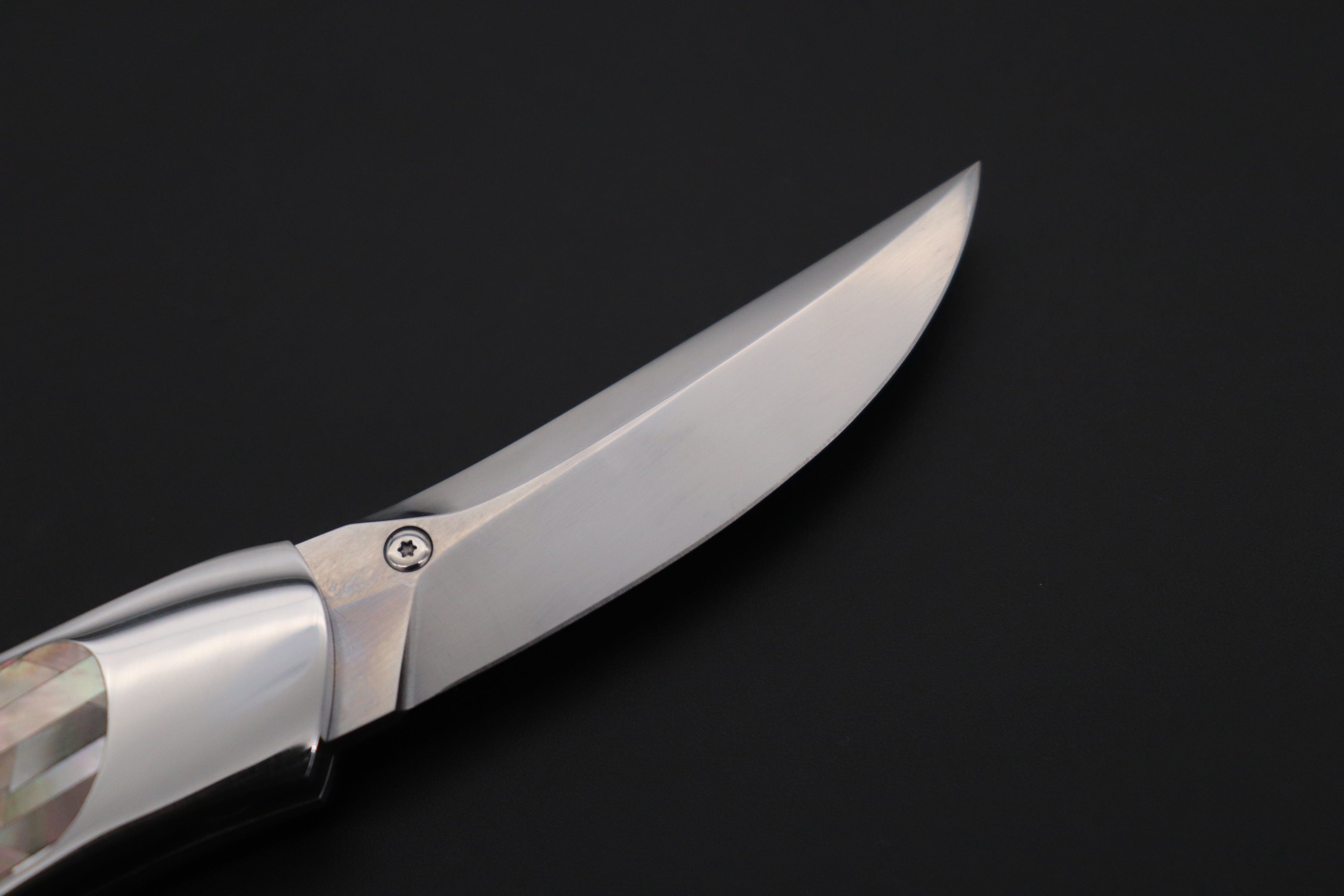 The solid stainless-steel handle is hand-rounded to perfection, giving it a warmth and softness rarely found in metal. Meticulously inlaid black mother of pearl sits seamlessly within the frame—every curve, every fit executed with absolute precision.
