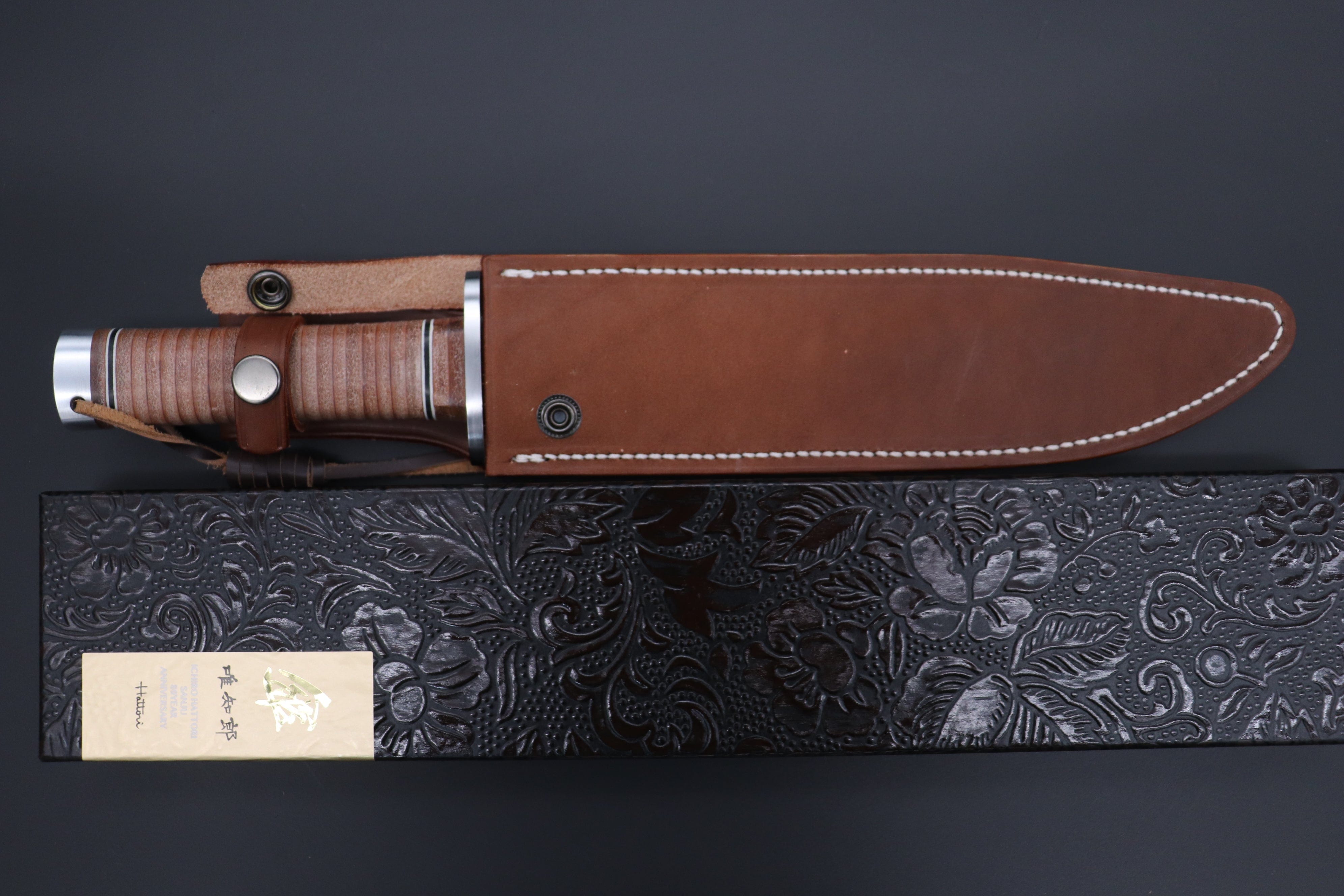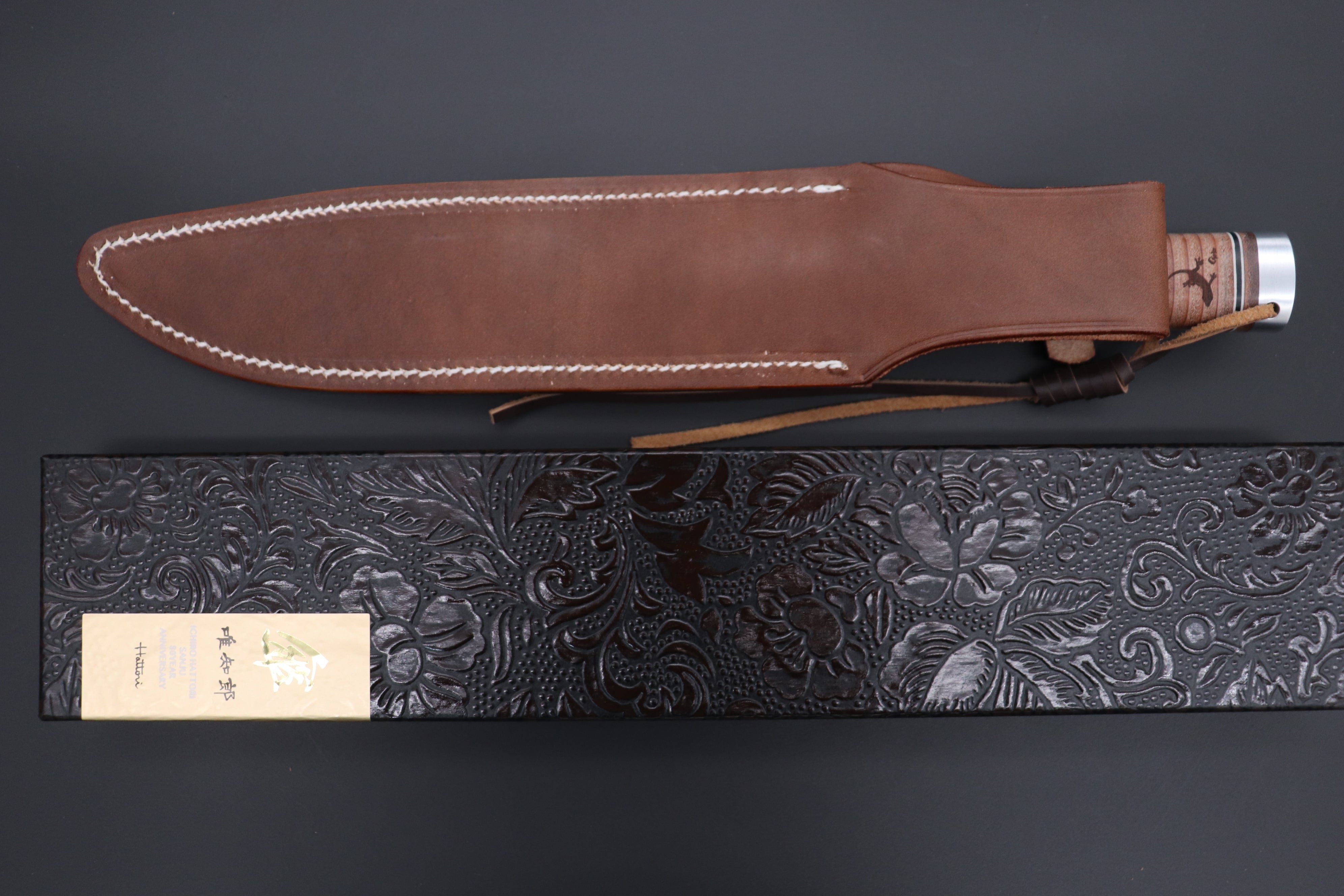The Leather Washer Handle has been etched with both the GECKO Trade Mark logo and comes with a special Gift Box, which is decorated with a special Sanjyu ("80-year anniversary") gold label and contains a commemorative message from Master Hattori. A hand-stitched leather sheath with belt loop and Hattori GECKO Original Certificate are also included. This knife collection is produced and available for only 2Pcs.