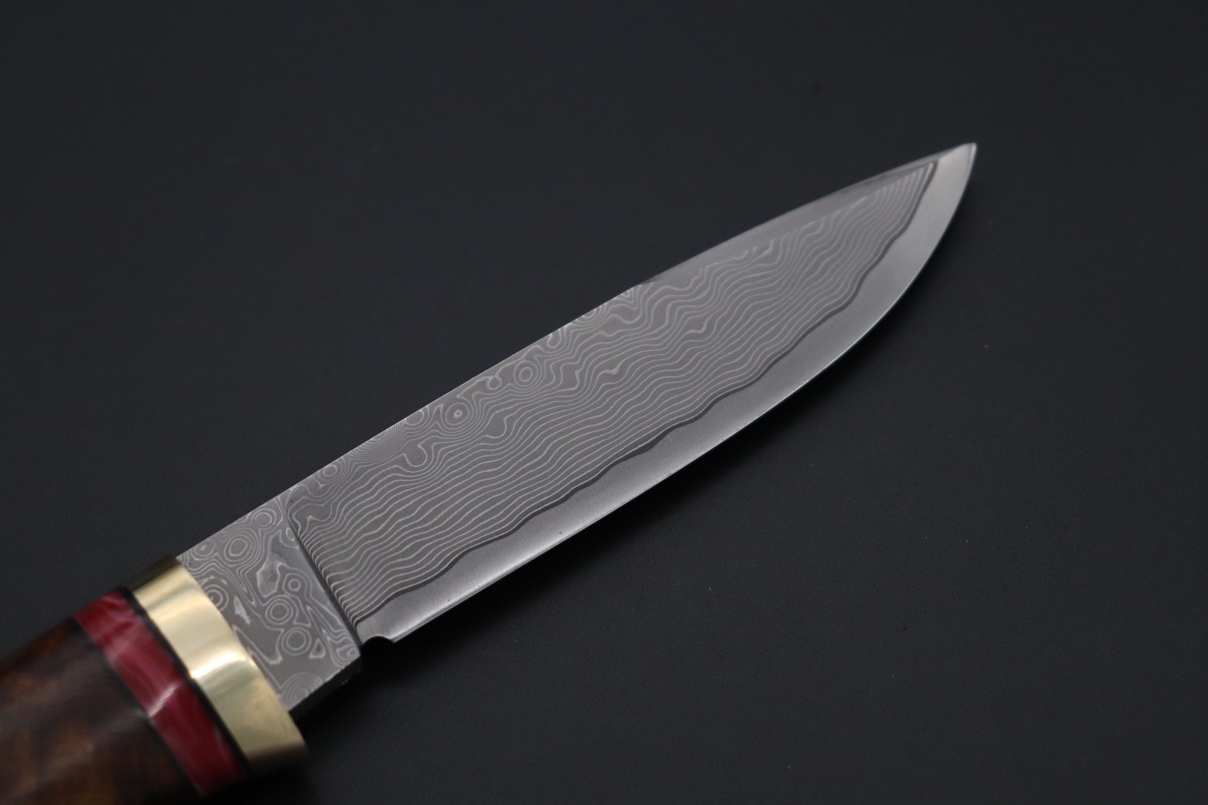 The Hattori SAN-147 Limited Cowry-X Damascus Special Utility Hunter is made of Hattori's exclusive Cowry-X Damascus - a Cowry-X powdered tool steel core forge-layered with Nickel and Stainless Damascus steel. It features a 4" utility blade with a hand-rounded Desert Ironwood and Spiny Oyster Gem-Composite Stone custom combination handle, solid brass hilt and buttcap, and hidden tang construction. Comes with a brown leather sheath and gift box.