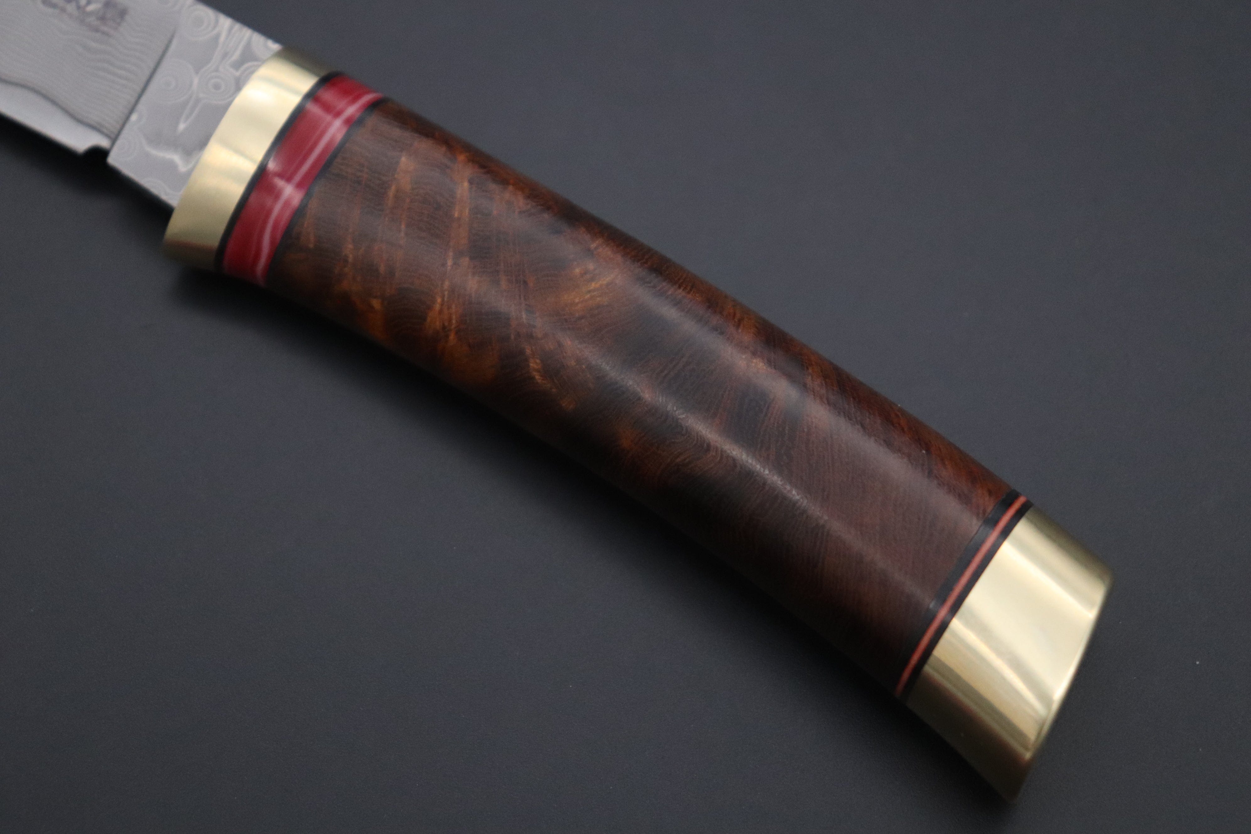 This is the 147th version of the Hattori "SAN" Limited Edition, celebrating his 80th anniversary year. Master Hattori has selected the Cowry-X Damascus Special Classic Utility Hunter and used the finest Desert Ironwood combined with Spiny Oyster Gem-Composite Stone for the custom combination handle. In this piece, Hattori's philosophy of honoring natural materials comes to life - each piece of wood has its own unique character and grain pattern, making every knife truly one-of-a-kind.