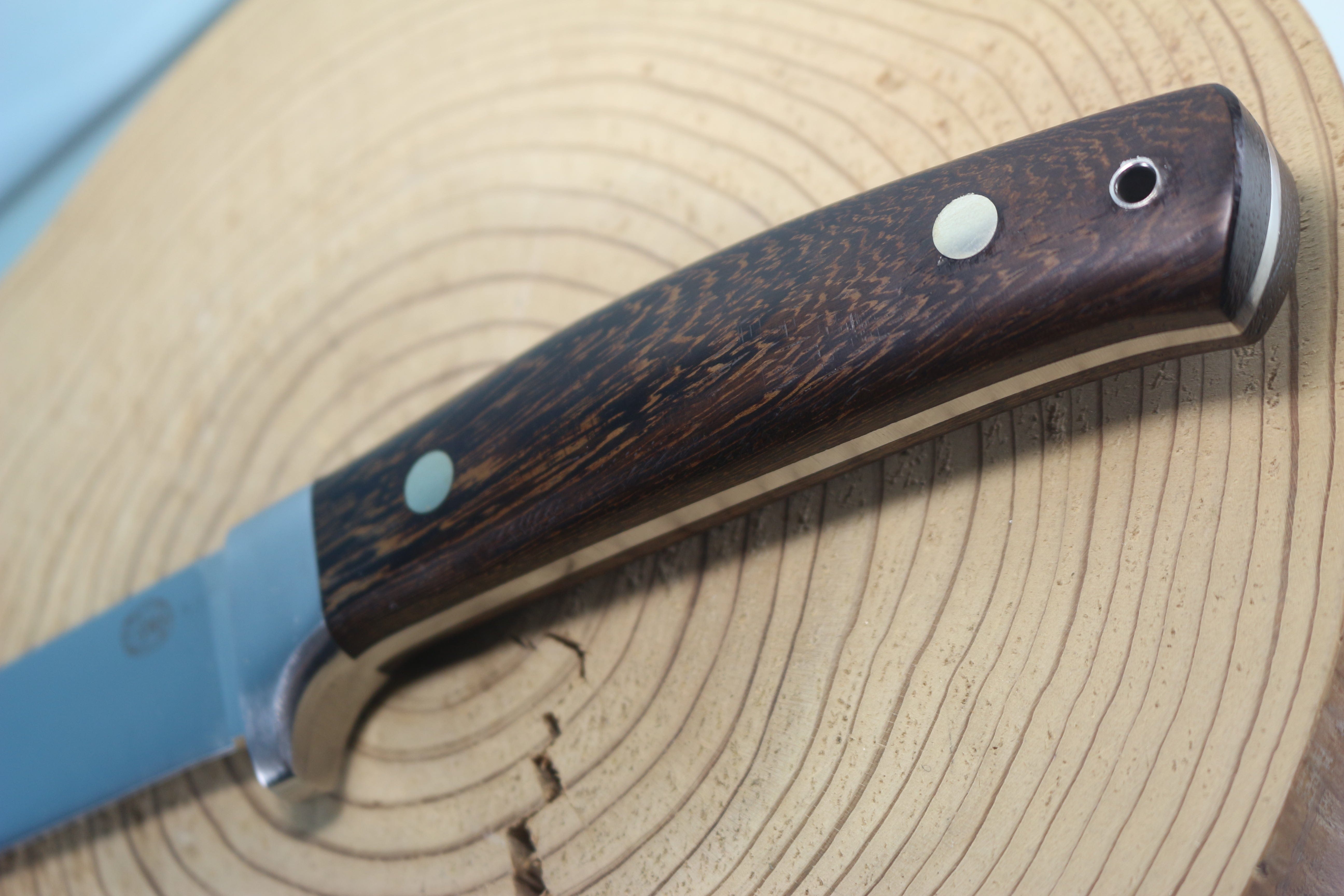 NOBUAKI YAMAMOTO NY-90  Drop point Hunter,   EDC All Purpose Utility knife!  4-1/2" Solid VG-10 Satin brushed Hamaguri-ba blade, 4-3/4" Hand contoured Japanese Tagayasan wood handle with Stainless steel Hilt, Full tang with 2 Brass rivets and Tubular lanyard hole on end, Comes with custom made Double stitched Brown Leather sheath.