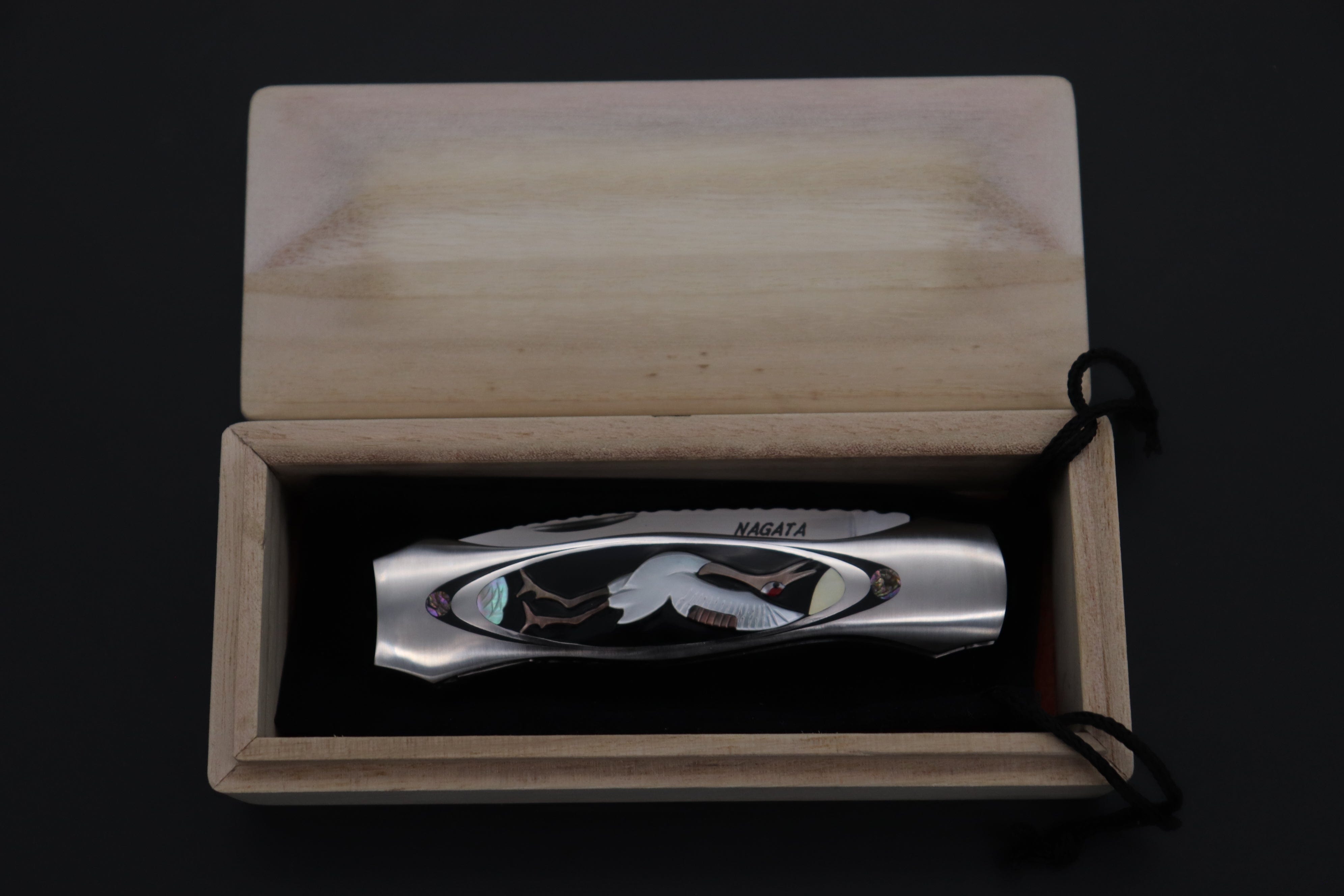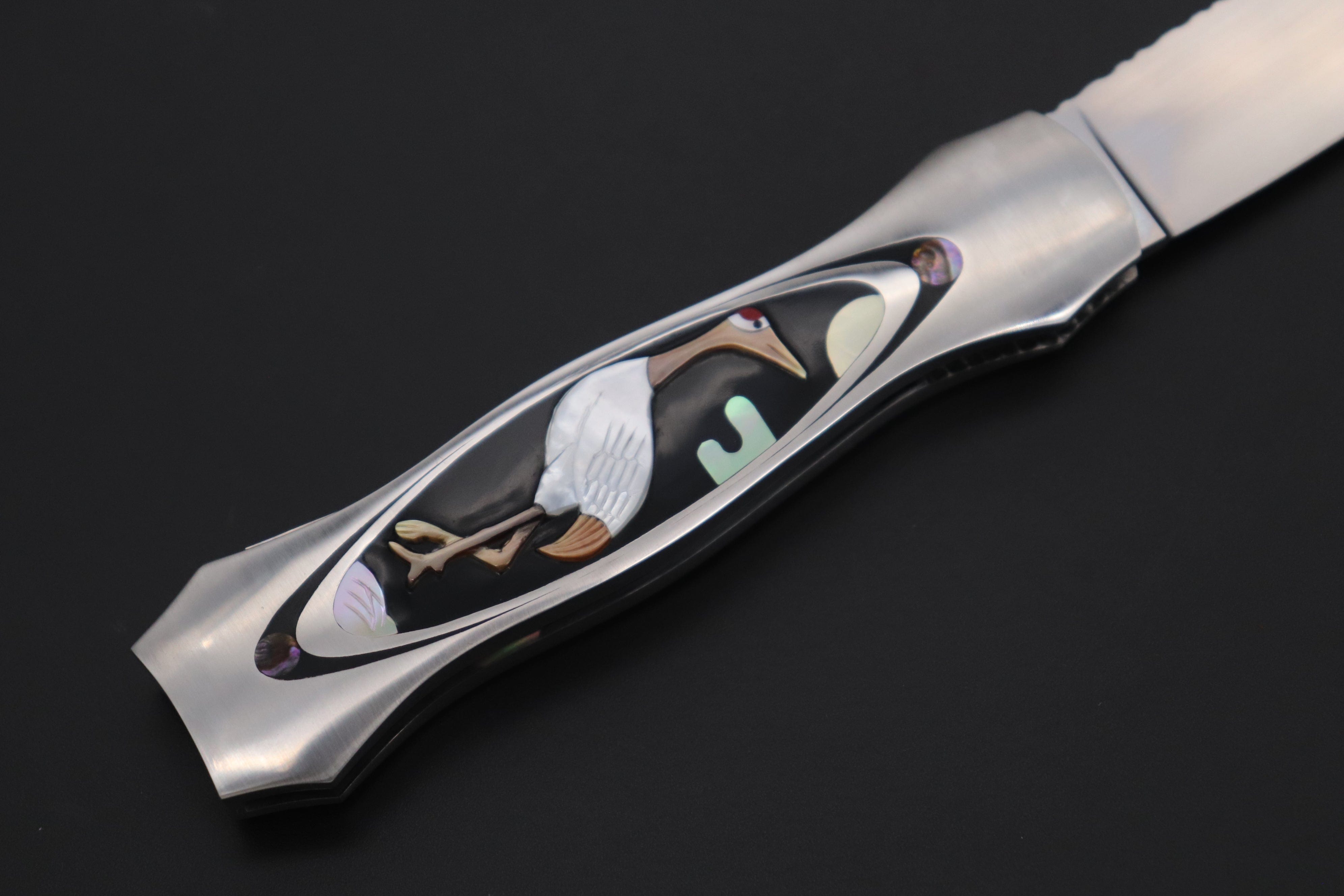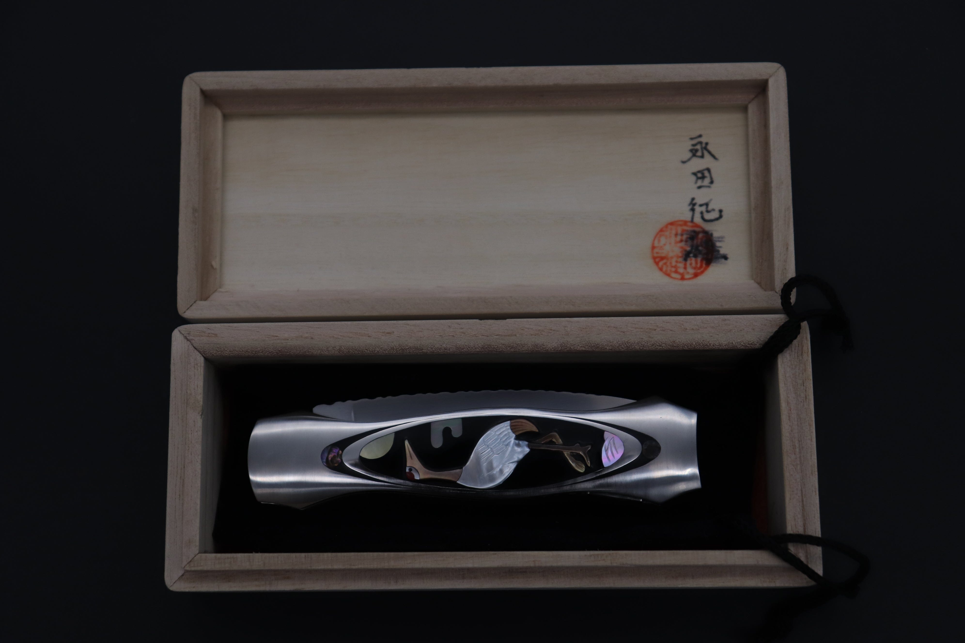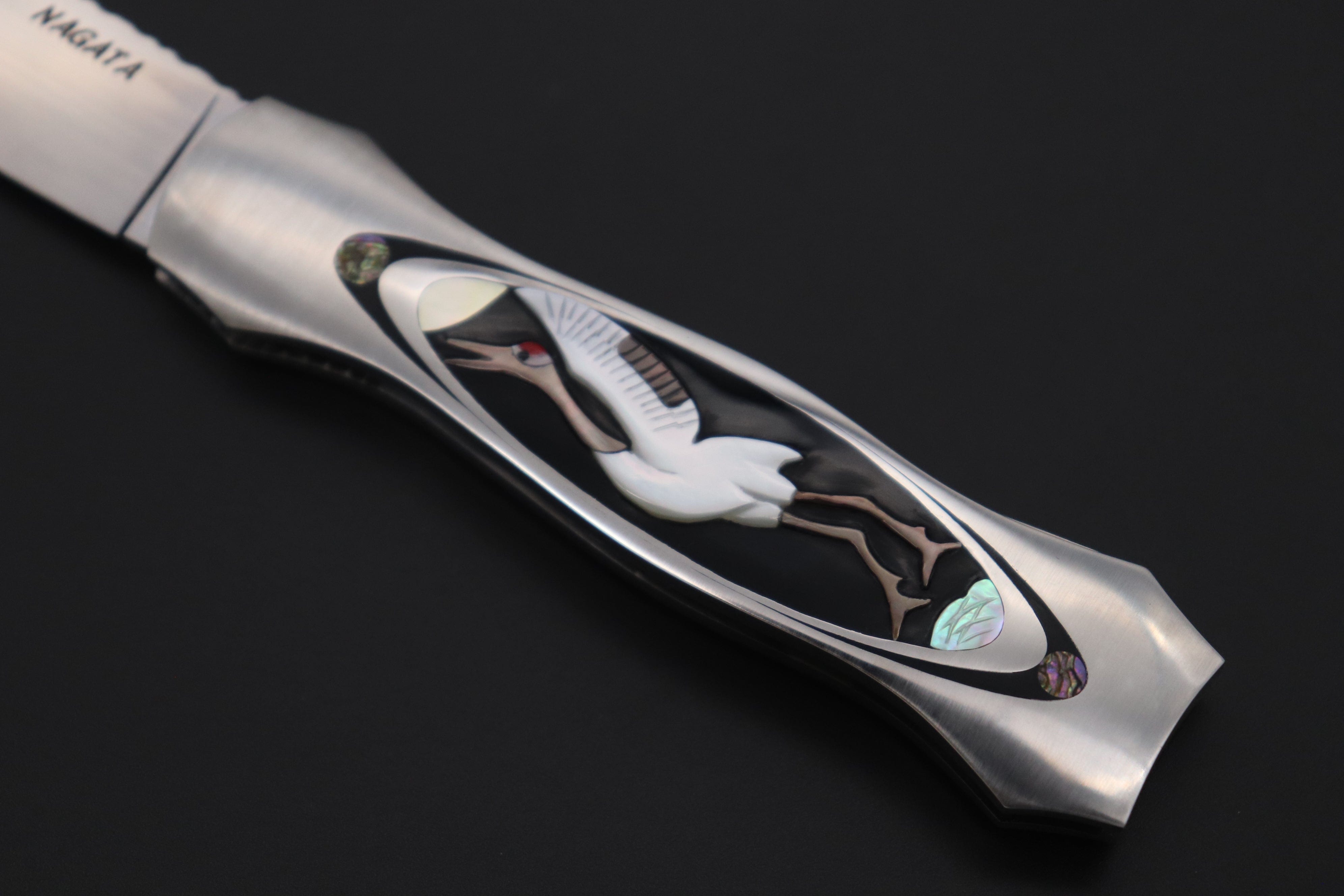 Knife Model: Ikuo Nagata Custom Folding Knife - IN-115 "STILETTO" Red-Crowned Crane Raden Art, Back Lock Folder