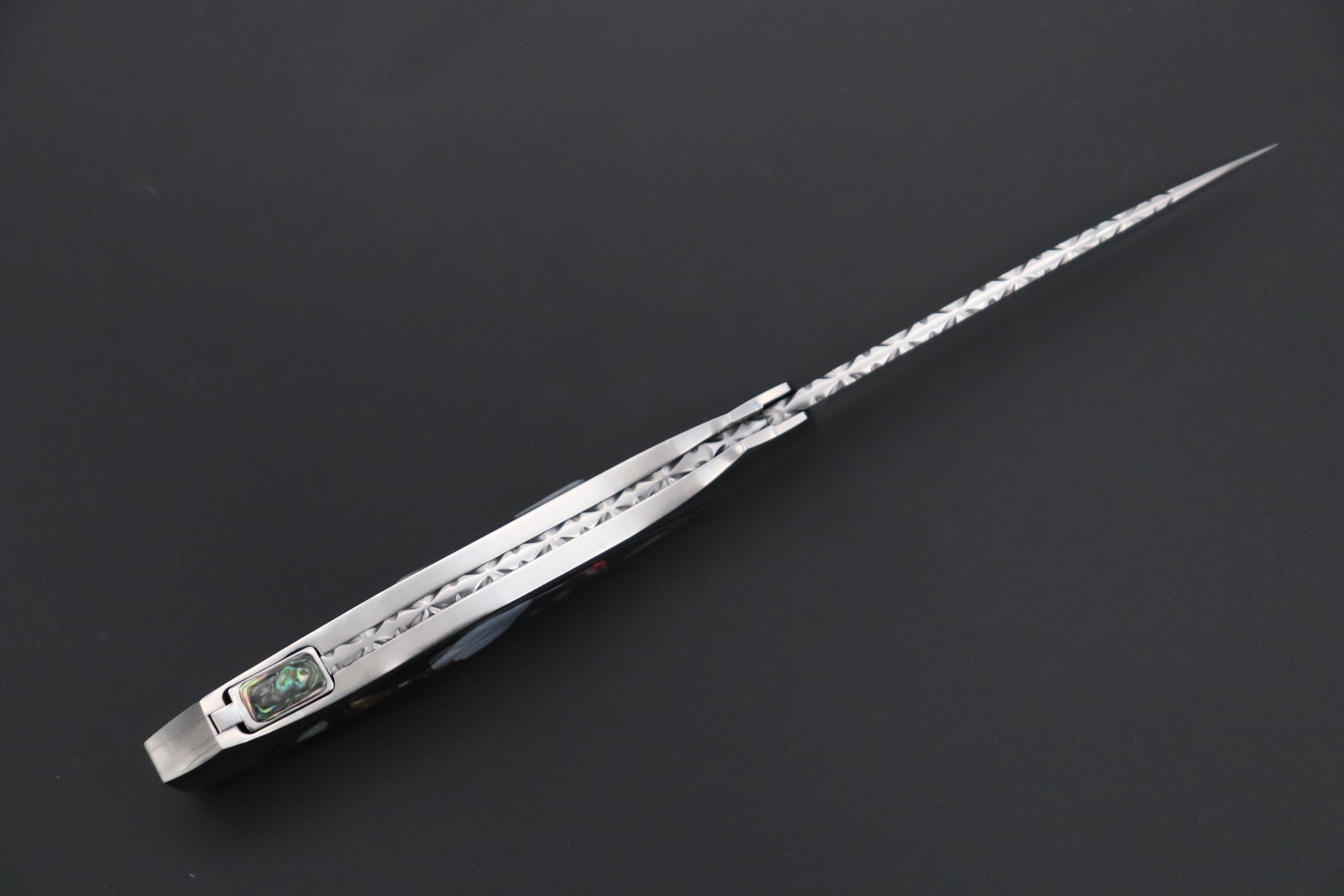 The RWL-34 mirror-finished blade with custom file work on backblade. Every detail, from the file-worked back spring bar to the inlaid lock release button, reflects Nagata’s meticulous dedication. Even the inner frame is inlaid with luminous shells, a hidden gem visible only to the owner.