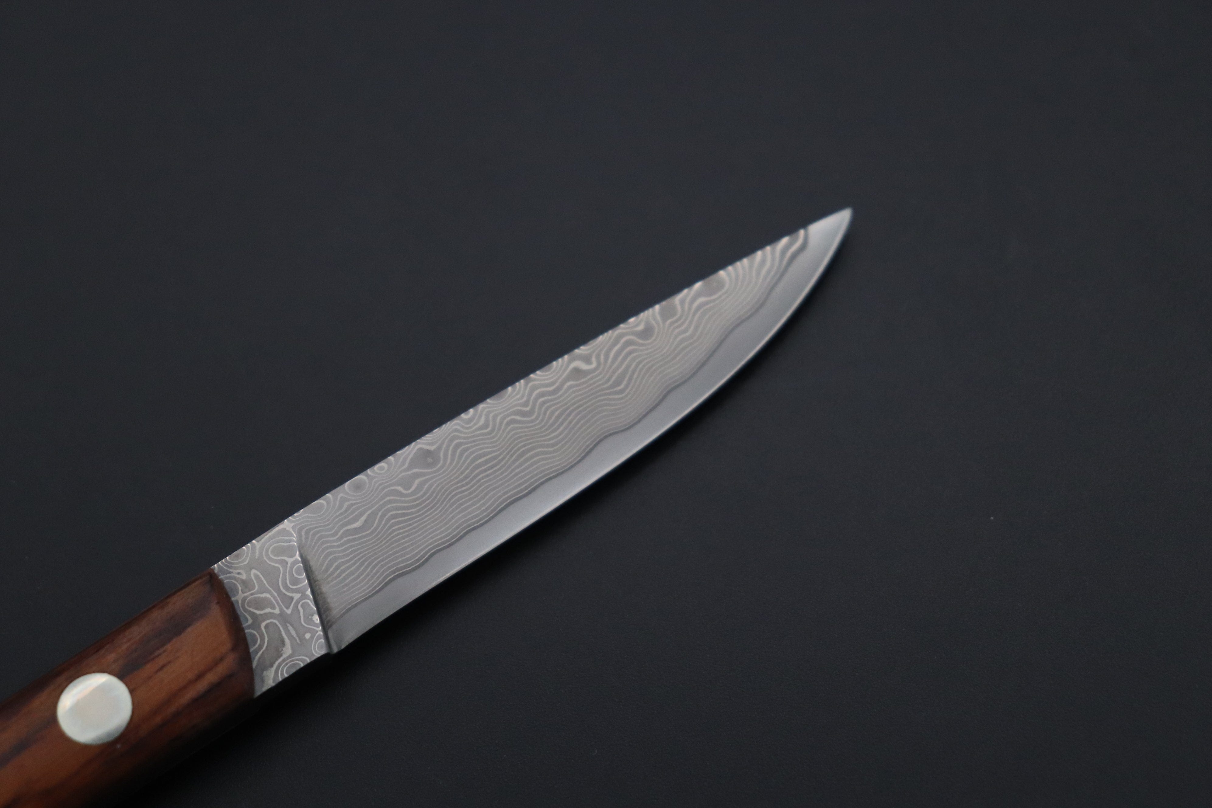 Scalpel style Utility knife with slim 2-1/2" Cowry-X core forge layered Nickel/Stainless Damascus steel blade. 4-inch Cocobolo wood handle. Tapered full tang fastened with large nickel silver rivet, small pin and lanyard hole tubuler. Comes with brown leather sheath