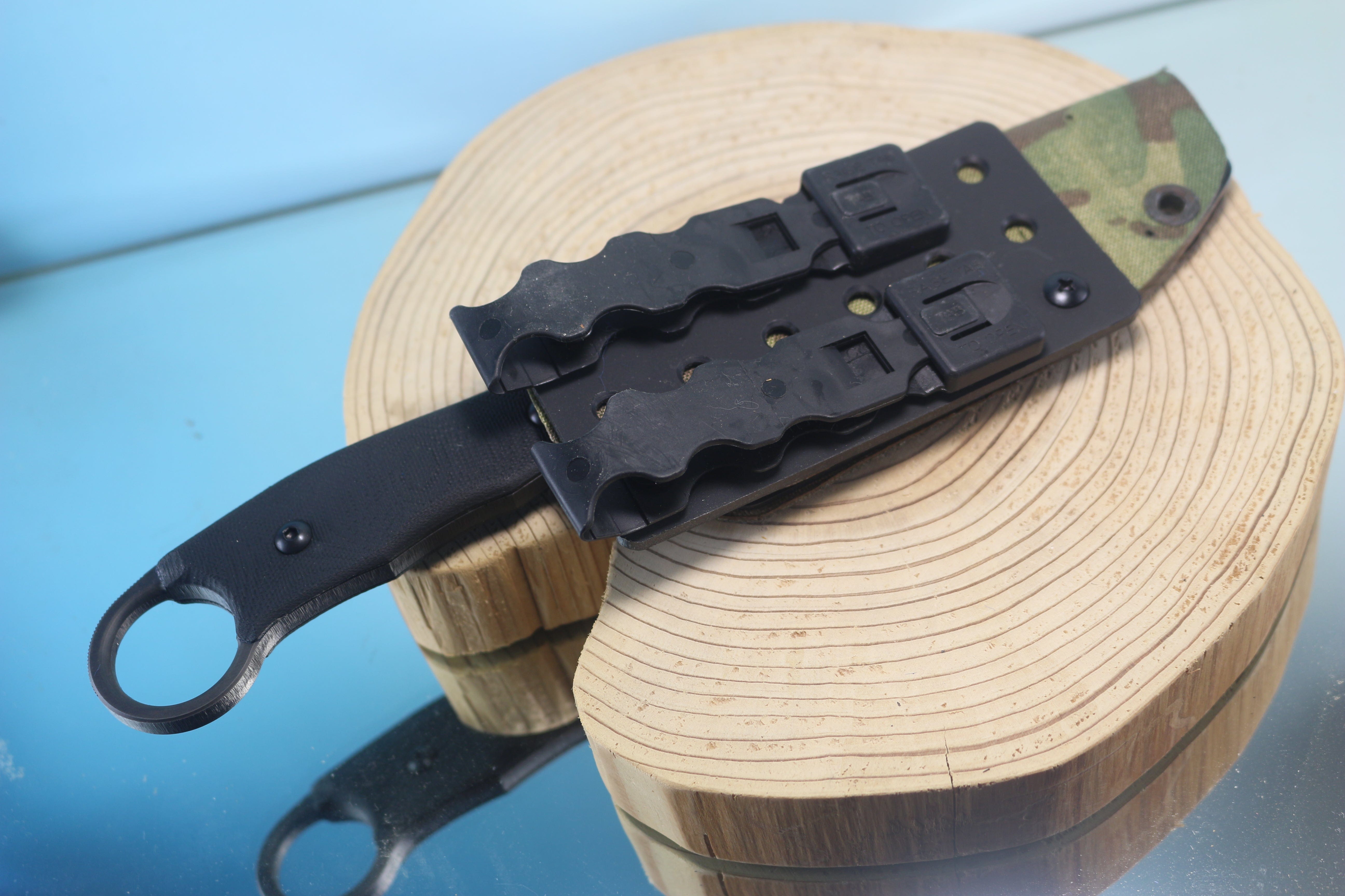 AT9-S Combat Utility Knife: By the request of a member of Japan Ground Self-Defense Force (JGSDF), Junpei Makari has designed and produced this all purpose Utility knife with an emphasis on versatility that can handle various tasks, and portability and expandability of the sheath. The blade is sharpened at different angles. It has a 5-inch non-glare black coated 440C spear point blade with a slightly concaved hollow ground body and thicker grinding toward to the blade tip for strength to prevent chipping. He believes the high Carbon and high Chromium SUS440C steel is an excellent choice for the hard use knives, because of a tough resistance to chipping and breaking as well as an ease of re-sharpening. Sharp spear point with swedge on the back for penetration. 4-3/4" Hand contoured and beads blasted Black G10 handle with thumb notches on back and finger ring on end. By attaching a ring to the rear end of the handle, it can be quickly taken out of the sheath and used. The handle is thinly finished, and the shape is designed assuming the usage like holding a firearm such as a rifle or a hand gun while holding a knife. It comes with TAFBILON (Japan made material similar to Kydex) sheath covered with Camo 500D SQUADRON Cordura Nylon that has slits to attach MOLLE compatible pouches, and Malice Clip that can be attached on both sides in different angles.