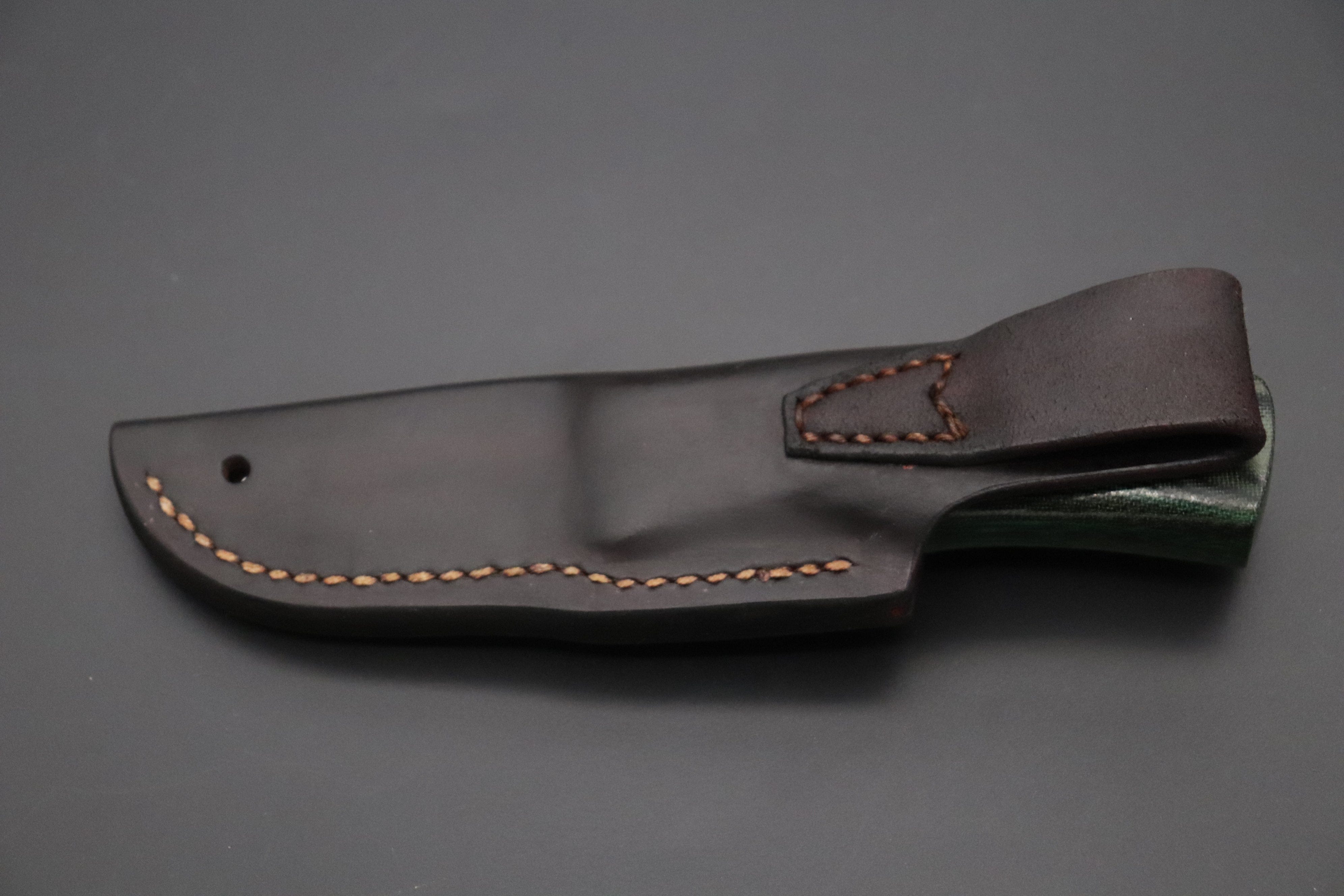4.3" Hand-contoured Vintage Canvas Micarta Handle with  Brass Hilt and Brass tubular Lanyard hole on end. Comes with Custom double stitched Leather sheath with belt loop.