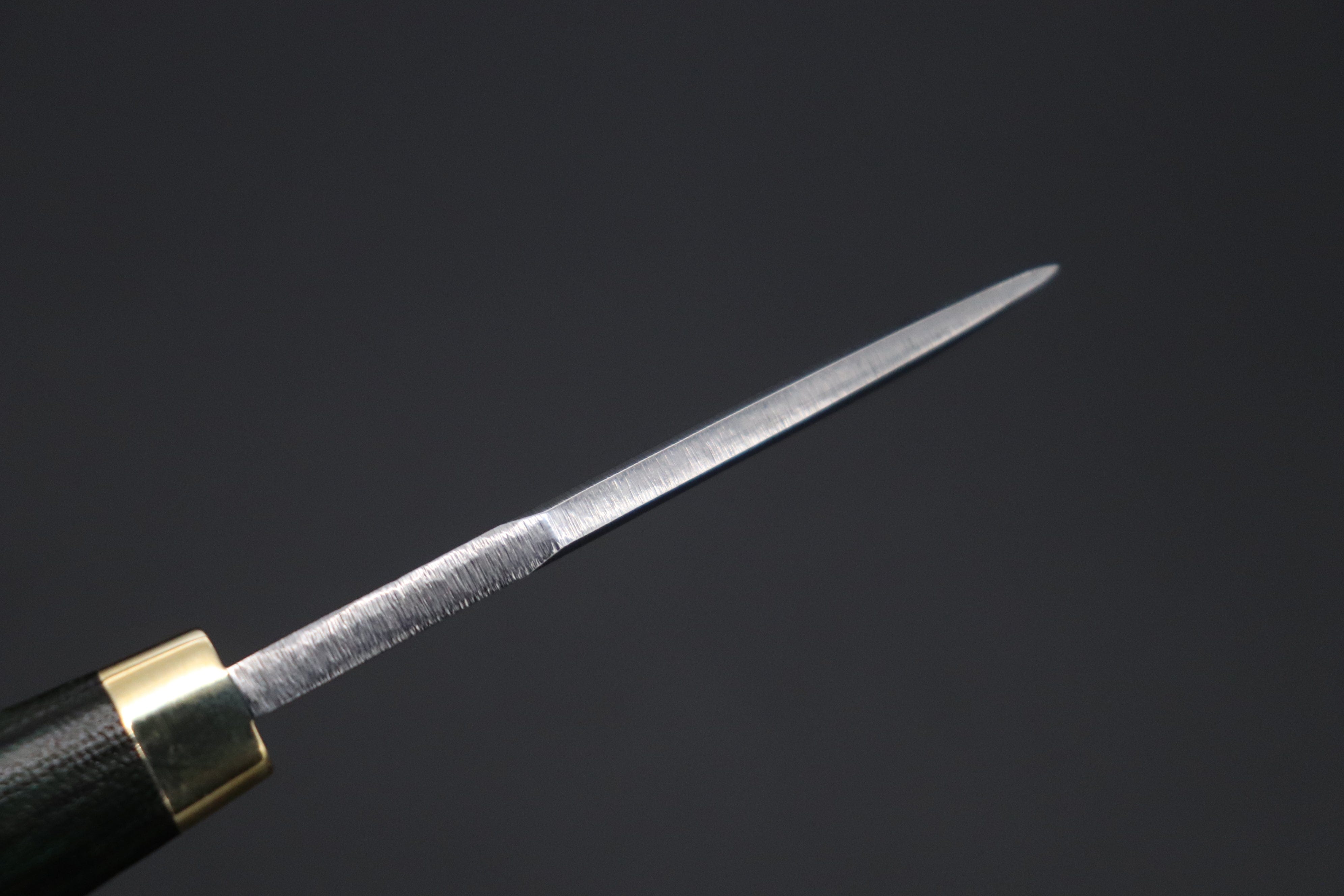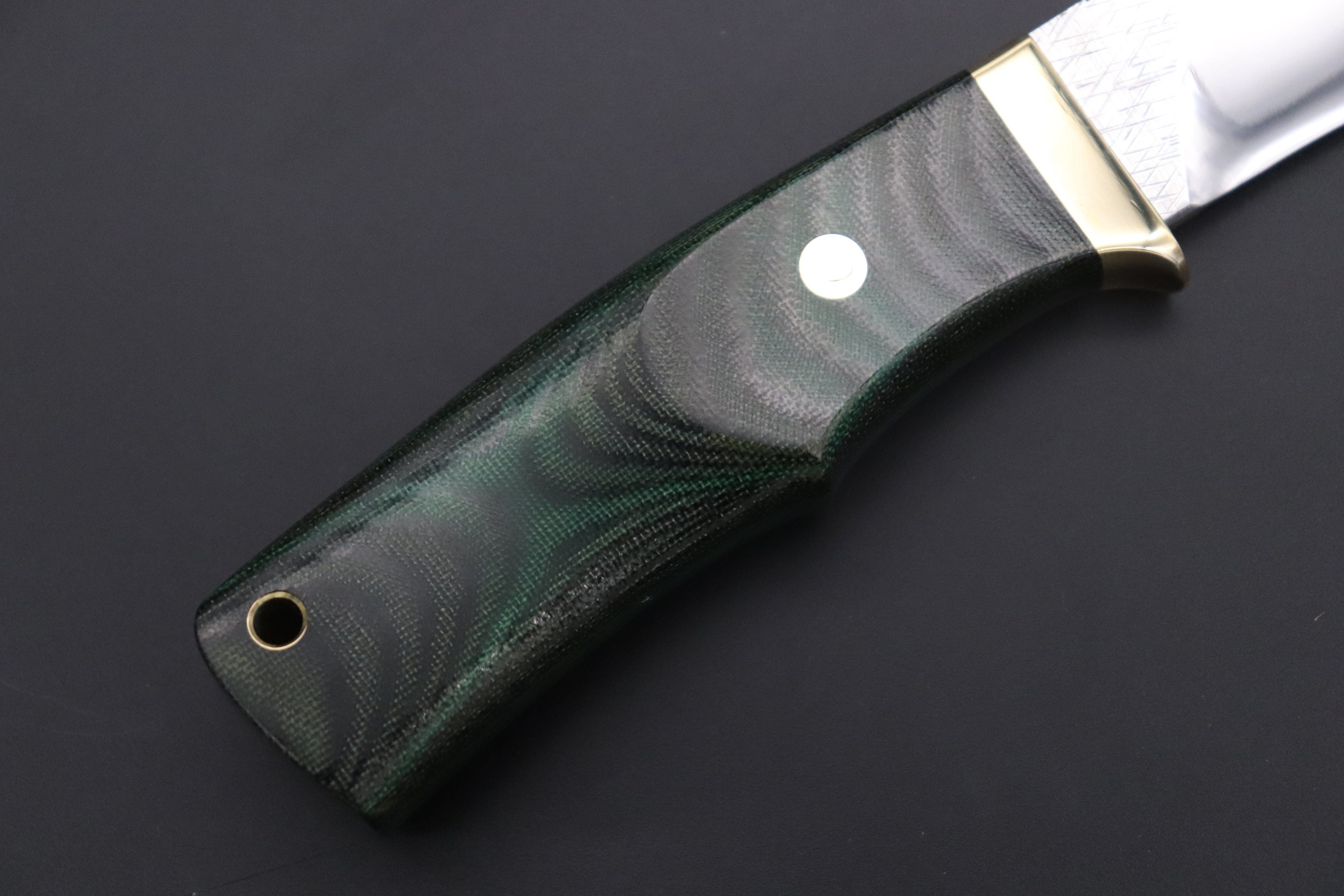 The handle is carved, handcrafted from great durable, strength, Moss Green Canvas Micarta, Mr. Takahashi accidentaly met this practical handle material and has been keeping this his favorite and practical material for over decades (for creating this custom knife).  Takahashi hand-contoured each handle symmetrically, working from the block while visualizing the finished form and considering how it will feel in the hand and how the owner of the knife will feel while gripping. Each handle is individually carved and polished to completion.