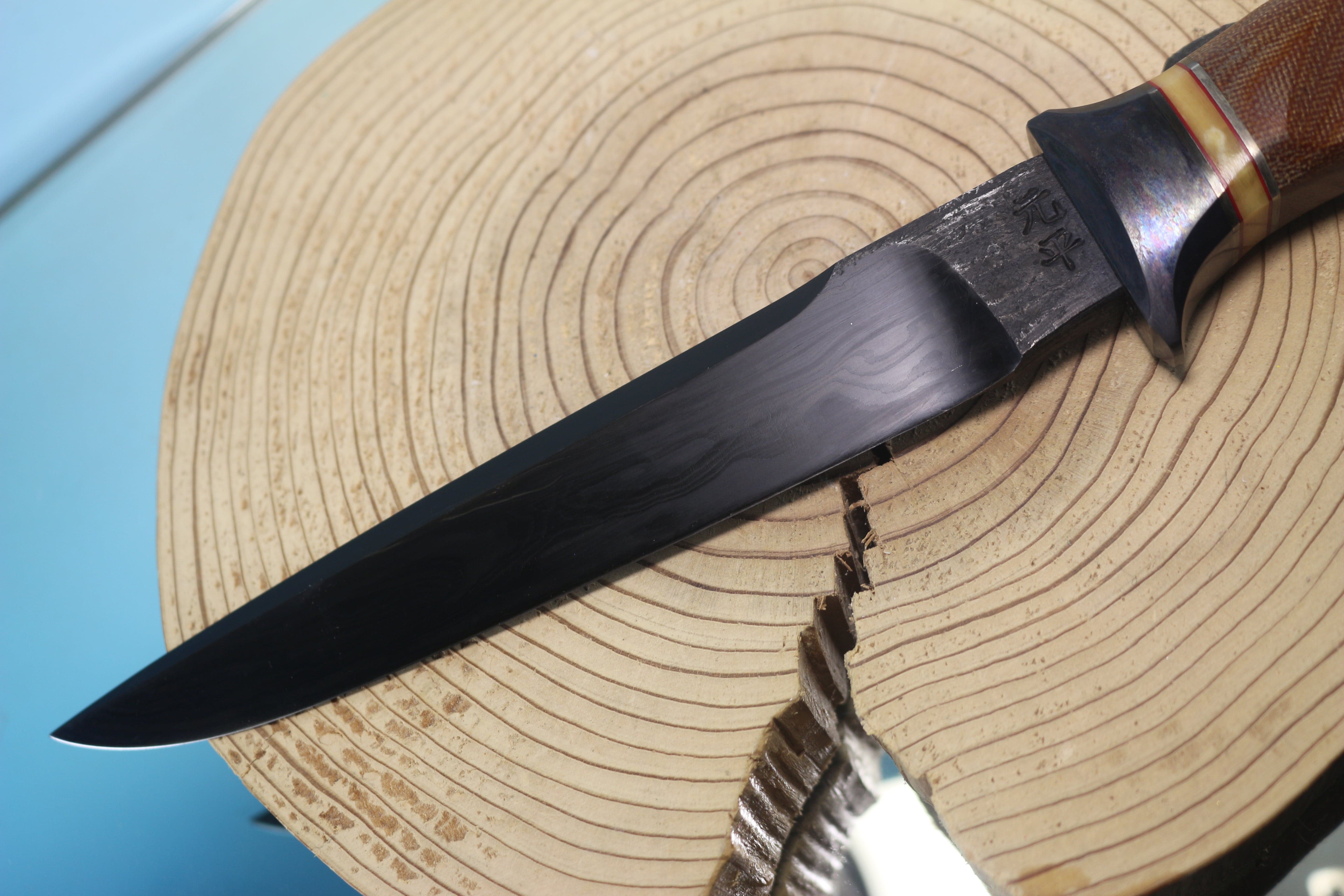 Mr. Sano just came up with Fighting knife, hand forged Stainless Damascus steel blade with Gunblued Black finish. This is the collaboration work with Mr. Nagatomo who worked to put the handle and unique carrying sheath. Mr. Nagatomo is a long time worker at Hattori Hamono in Seki and a trusted apprentice of Grand Master, Ichiro Hattori.