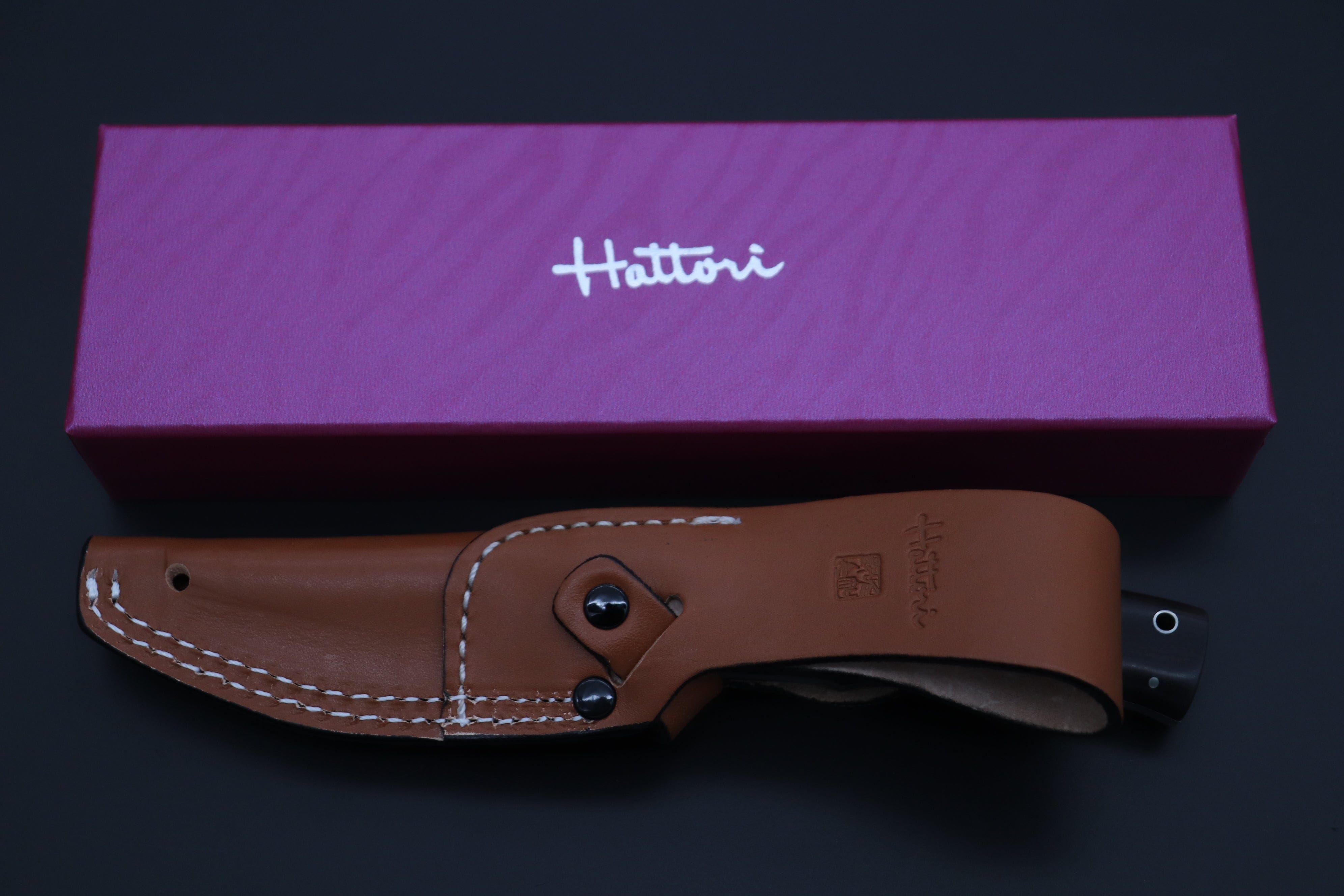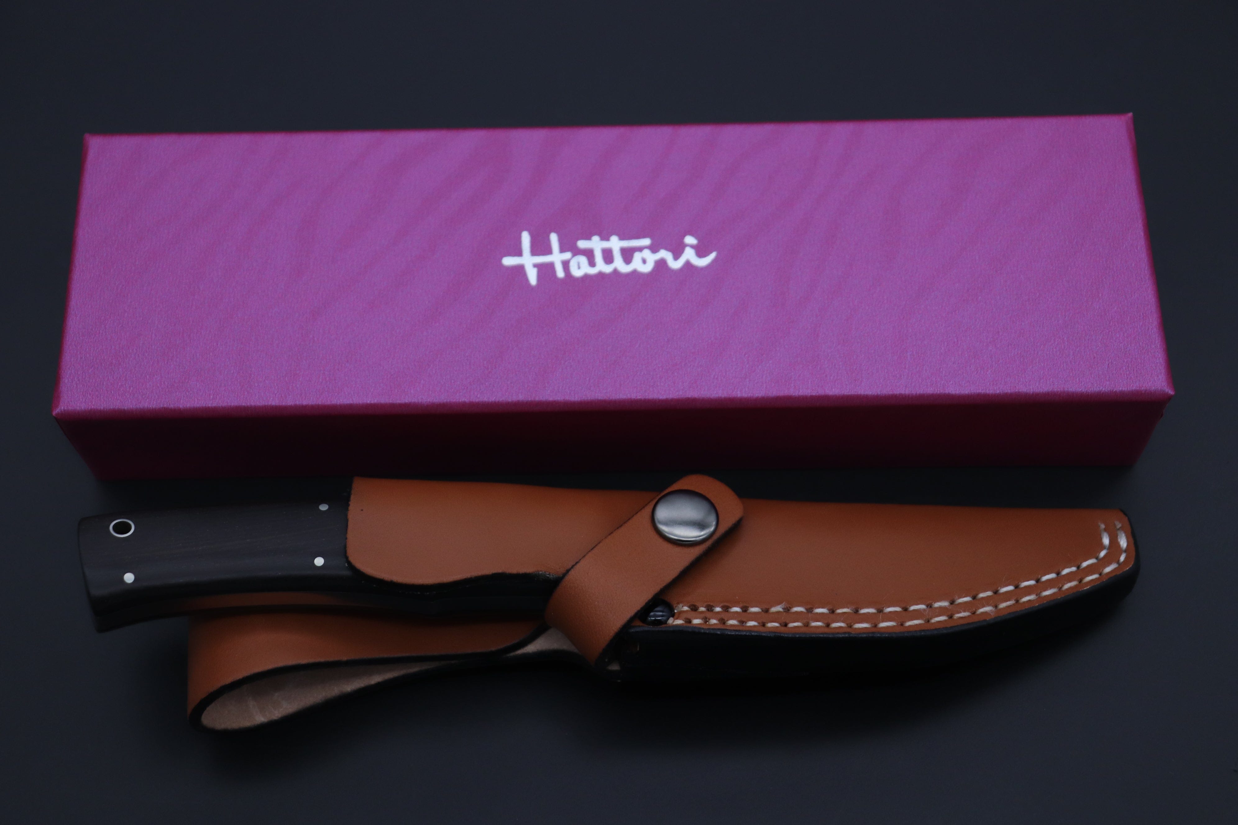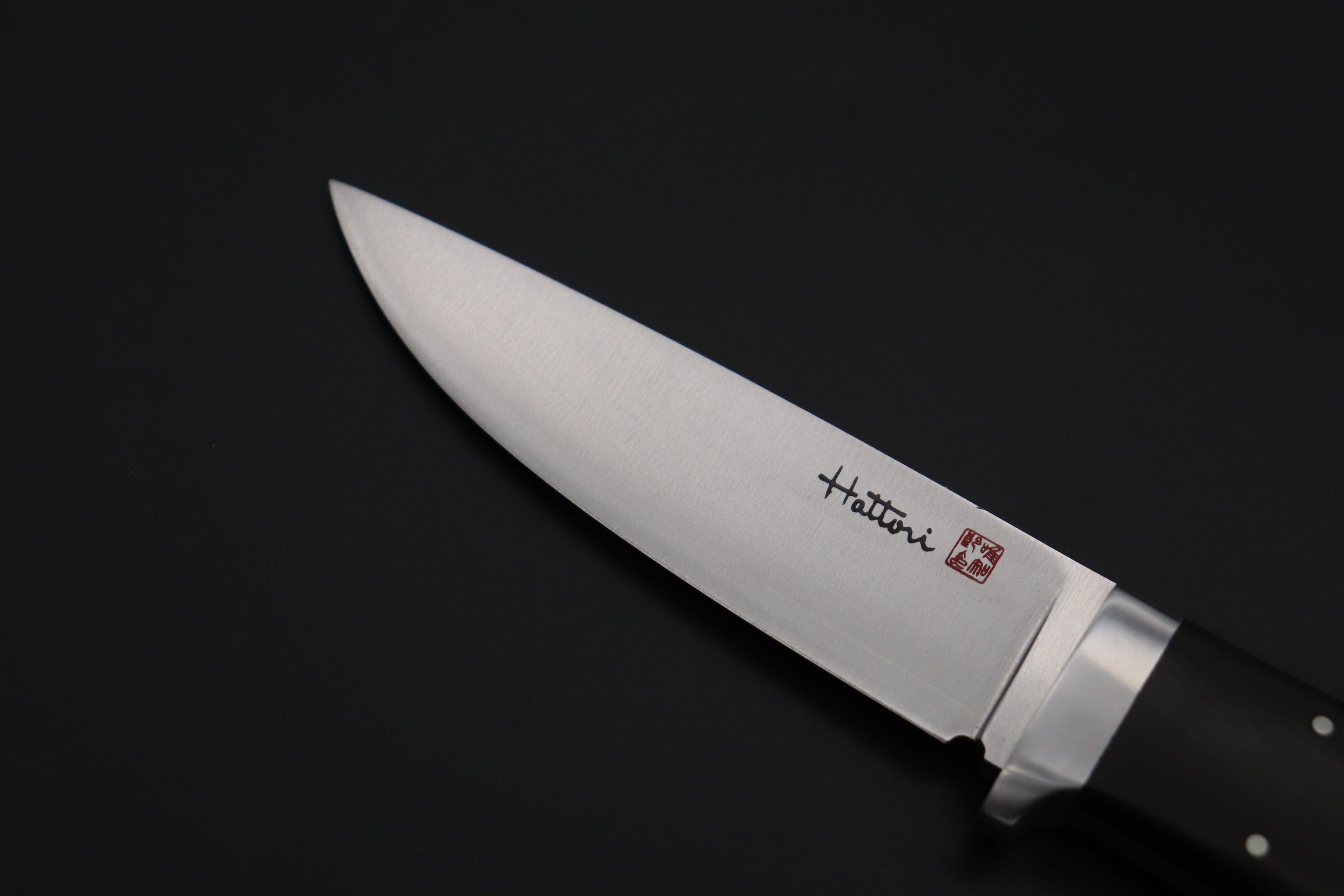 Hattori's sophisticated urban style knife. The blade is VG-10 San Mai (VG-10 core edge clad with 420J2 stainless steel blade) 4-inch semi-drop point Hamaguri-ba blade in his beautiful half mirror polish and 4-1/2" modern design hand contoured Ebonywood handle with Nickel silver hilt and 5 pins & tubular lanyard hole. Comes with double stiched custom brown leather sheath.