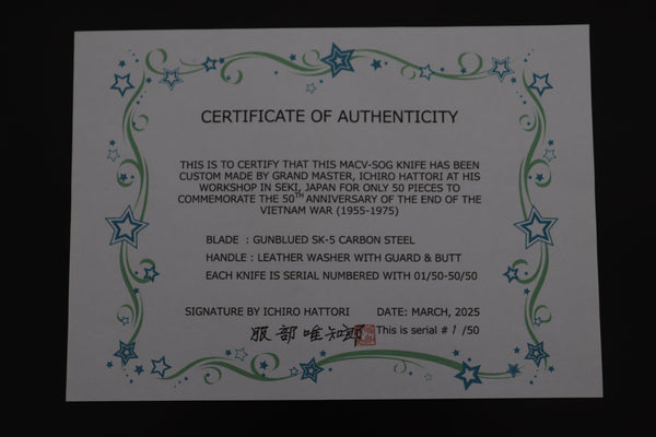The knife comes with Black leather sheath with sharpening stone pocket, and Presentation Wooden Box with "De Oppresso Liber" SF emblem attached on the lid. You will also find Special Forces coin, MACV-SOG sticker and U.S. Army patches included in the box. The first Serial #01-10 also includes United State Army coin and more patches. Please enjoy the historical treasure knife in a decorative display wooden box with "Certificate of Authenticity" signed by Ichiro Hattori, and "History of Hattori & MACV-SOG Knife" Your choice of the serial numbers 01/50 - 50/50, and the price varies by serial number.