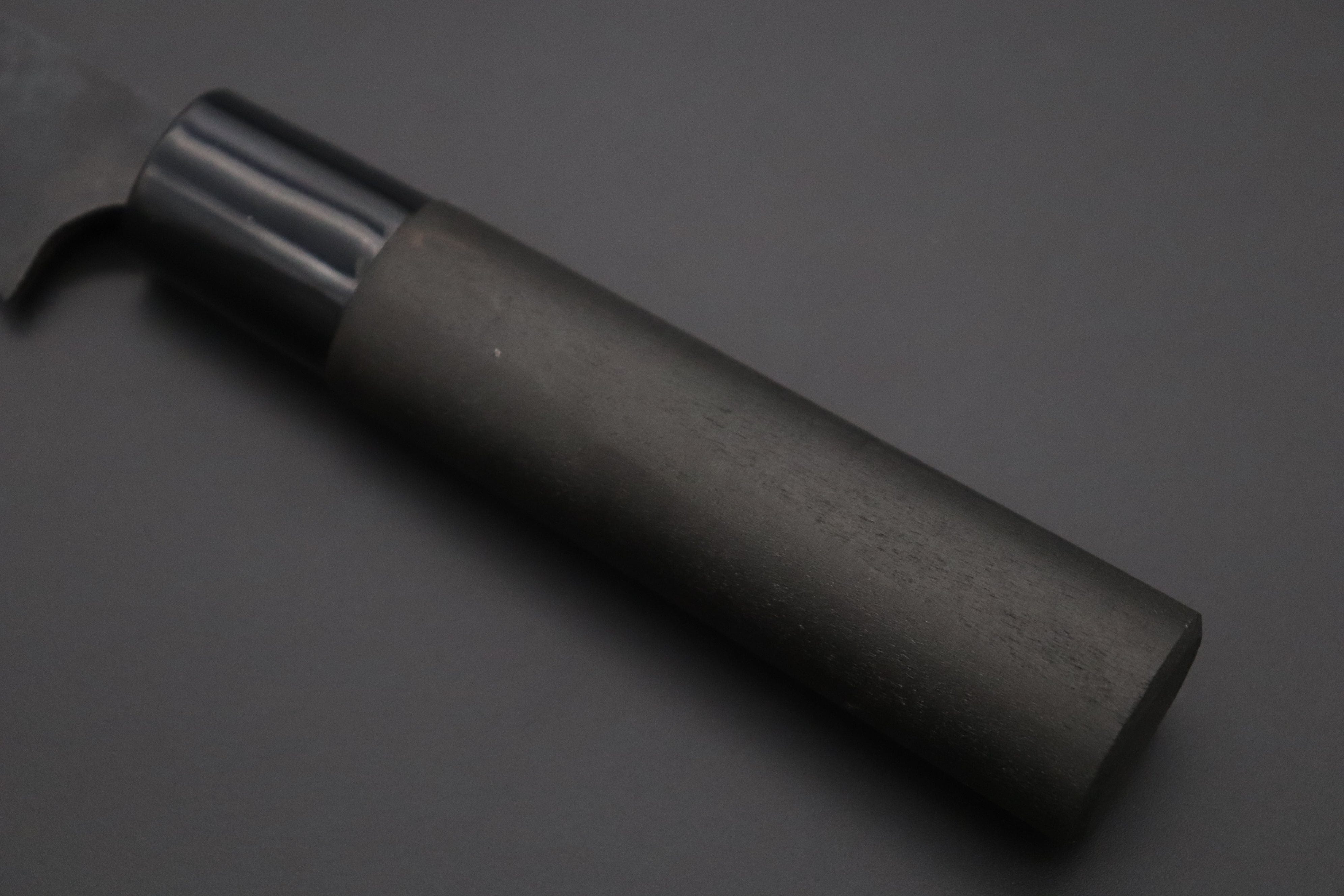 Kenta Nomura has chosen Japan's reputable carbon steel "Hitachi White steel No.2 Damascus Carbon Steel " for his custom knife. The blade features a natural  Black Forged Kurouchi Finish, showcasing a natural Black, Grey and Silver Graduation Damascus pattern.