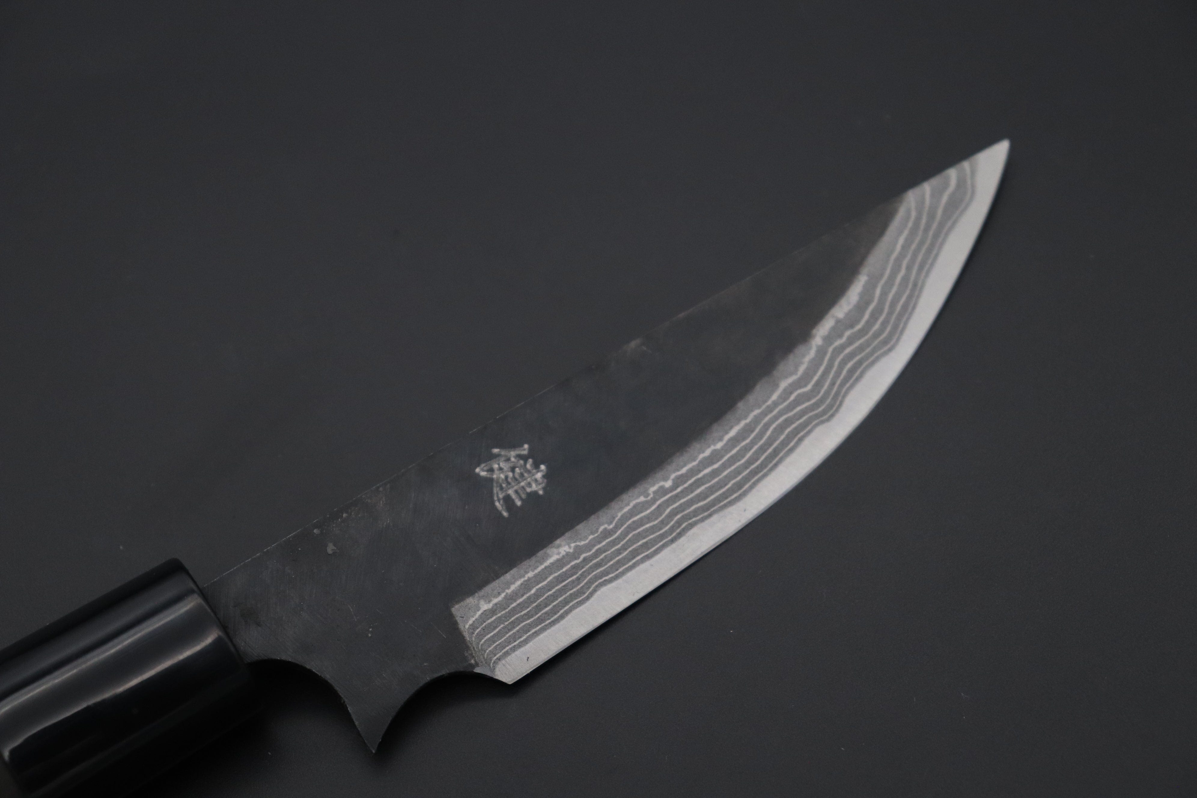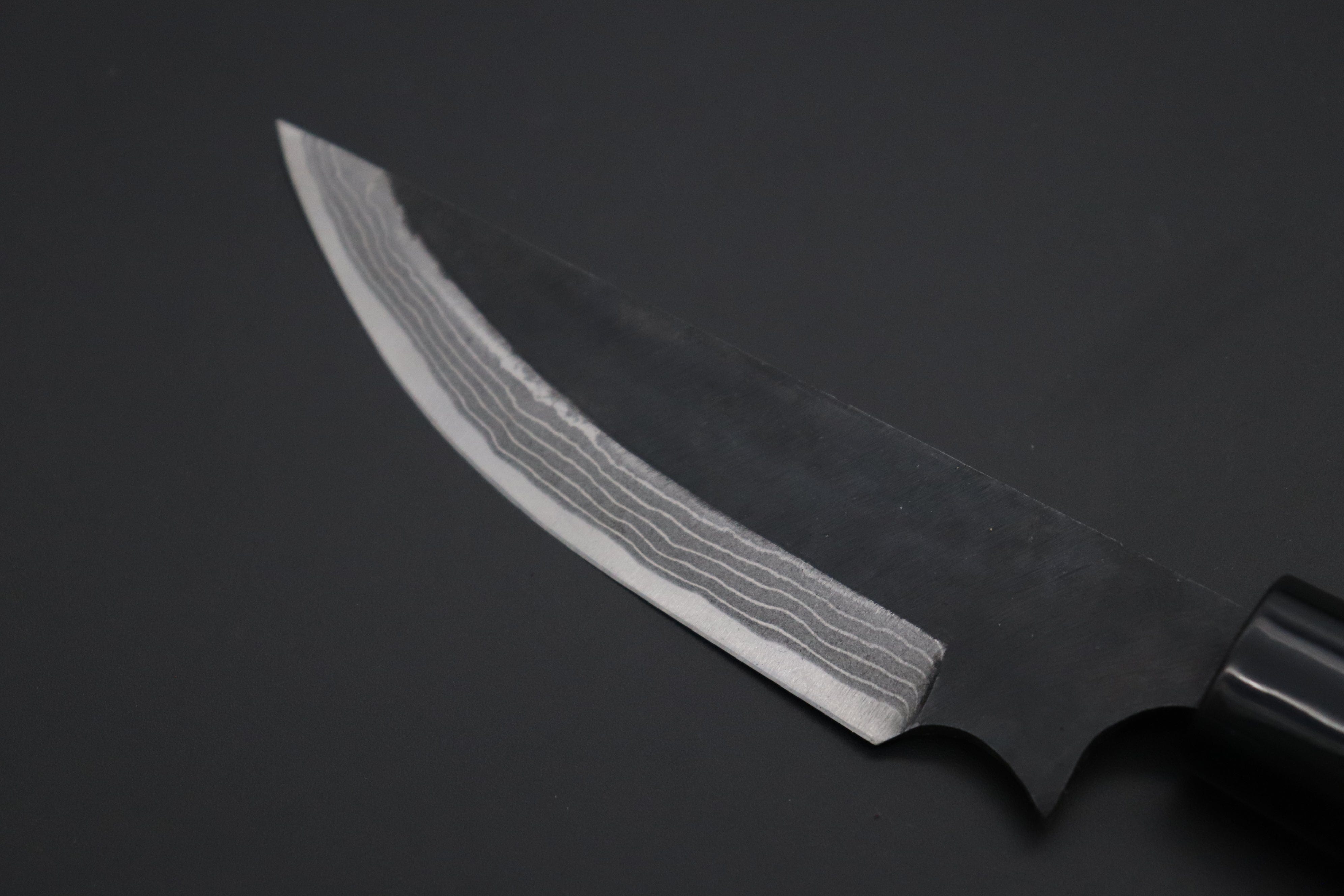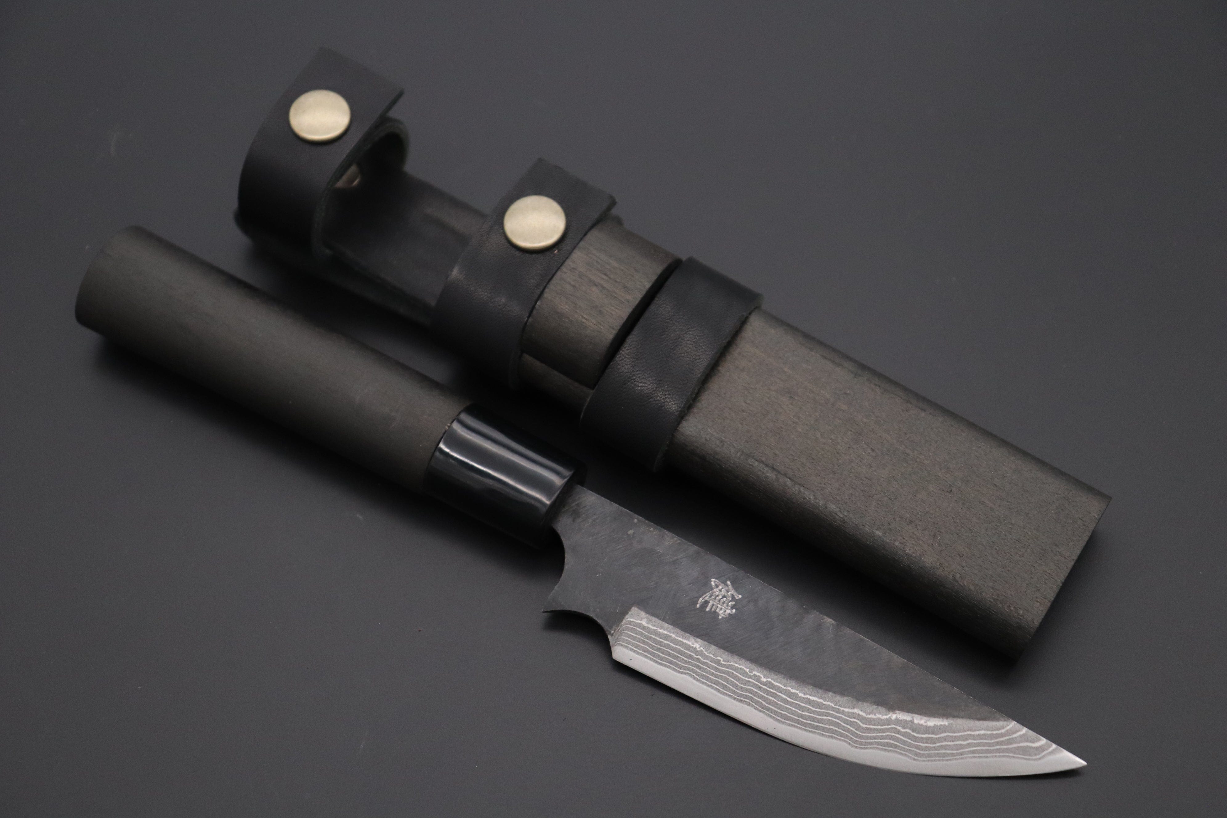 Convex Blade Profile, 4.7' Kurouchi Damascus, which combines tradition, strength, and durability, enhances the knife's appearance, and nicely complemented by the matching black natural wooden handle and sheath.