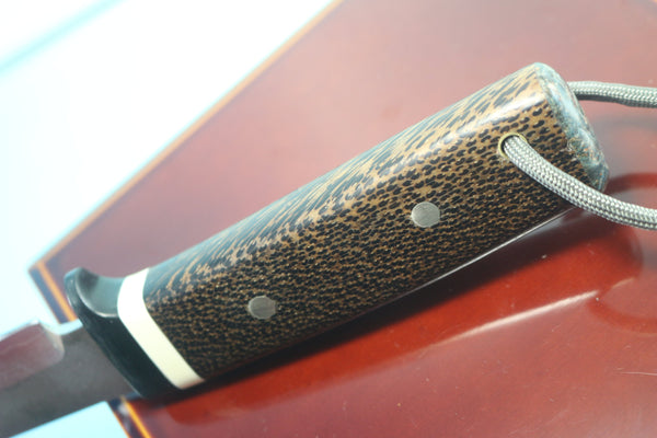 FI-780 Palm Hunter: 5-inch VG-10 core forge layered Damascus steel Hollow ground blade with long swedge on back, 4-3/4" Hand rounded Black Palm wood handle with Black Micarta Hilt and Ivory spacer and Exotic Boxelder butt cap on end, Hidden tang with Nickel silver rivets and Brass tubular lanyard hole with OD Paracord strap, Comes with custom made Dark Brown leather sheath