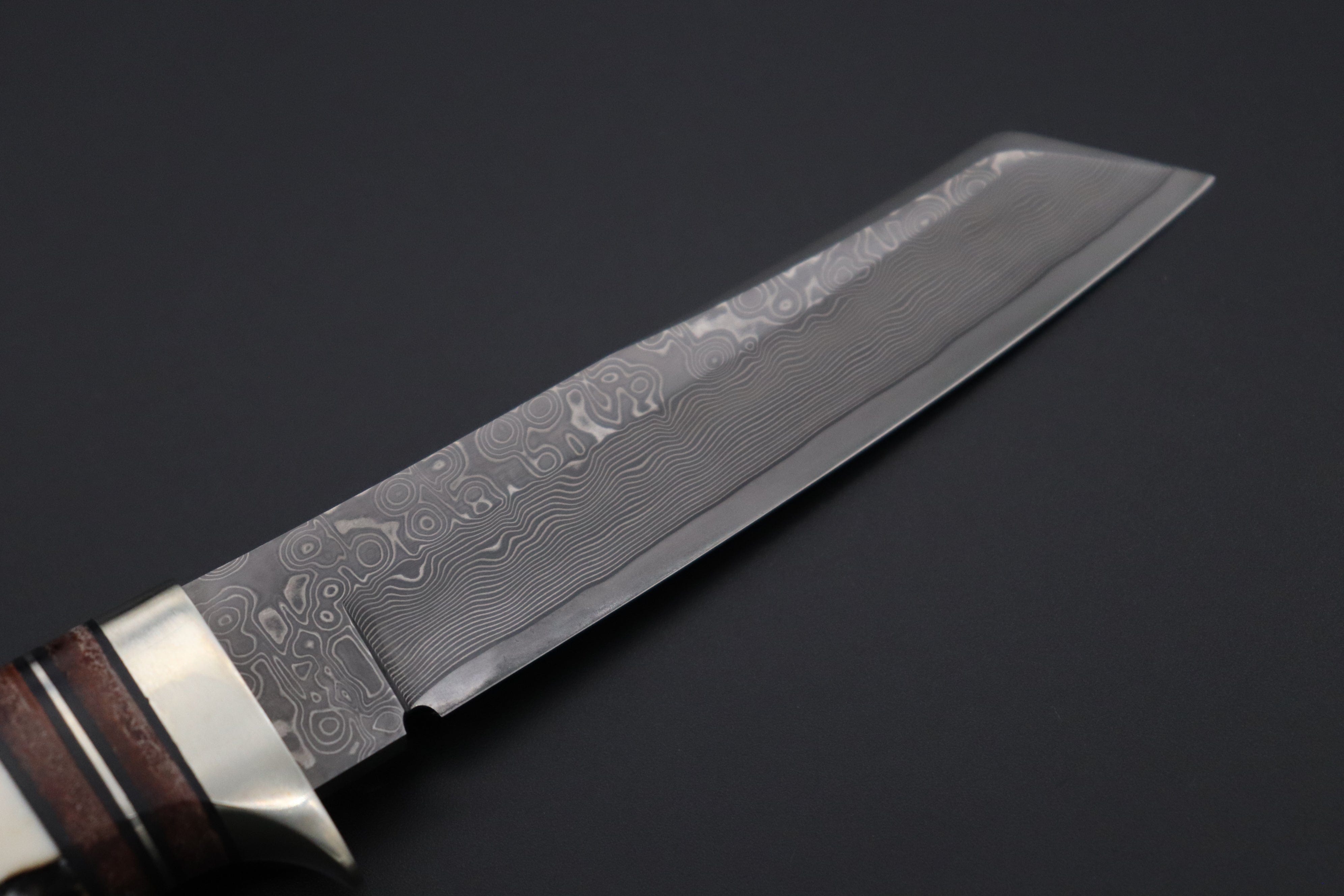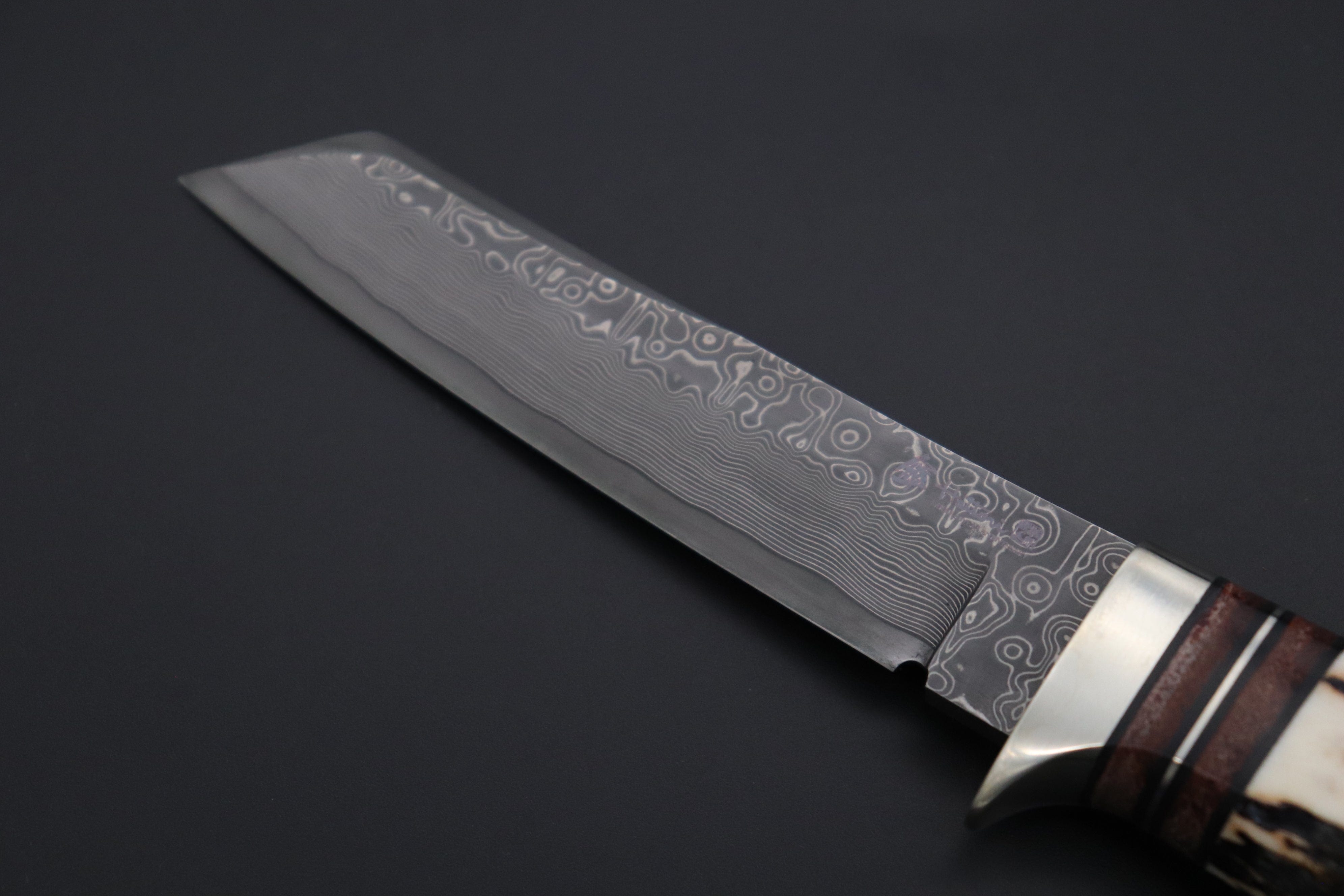 Hattori SAN-127E Limited Cowry-X Damascus Tanto has unique reverse blade tip Tanto made of Hattori's exclusive Cowry-X Damascus, Cowry-X powdered tool steel core forge layered Nickel and Stainless Damascus steel (30 layeres on each side), 4.3" Tanto style blade with sharp Kiridashi tip and swedge on back, 4.4" Hand rounded premium Stag handle with Leather Washer Spacers, solid Nickel Silver Hilt, Hidden tang, Comes with Brown leather sheath, and Gift box.