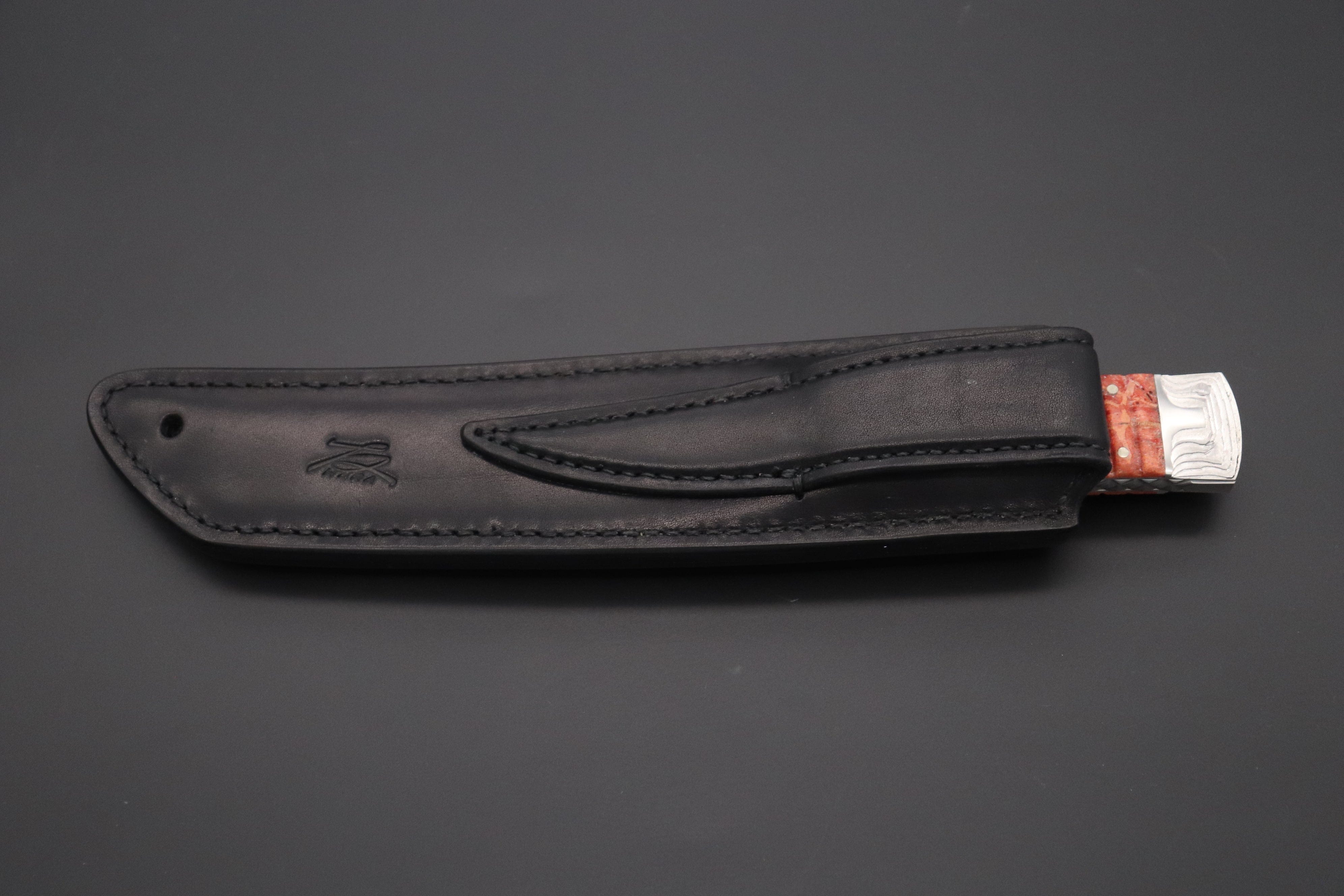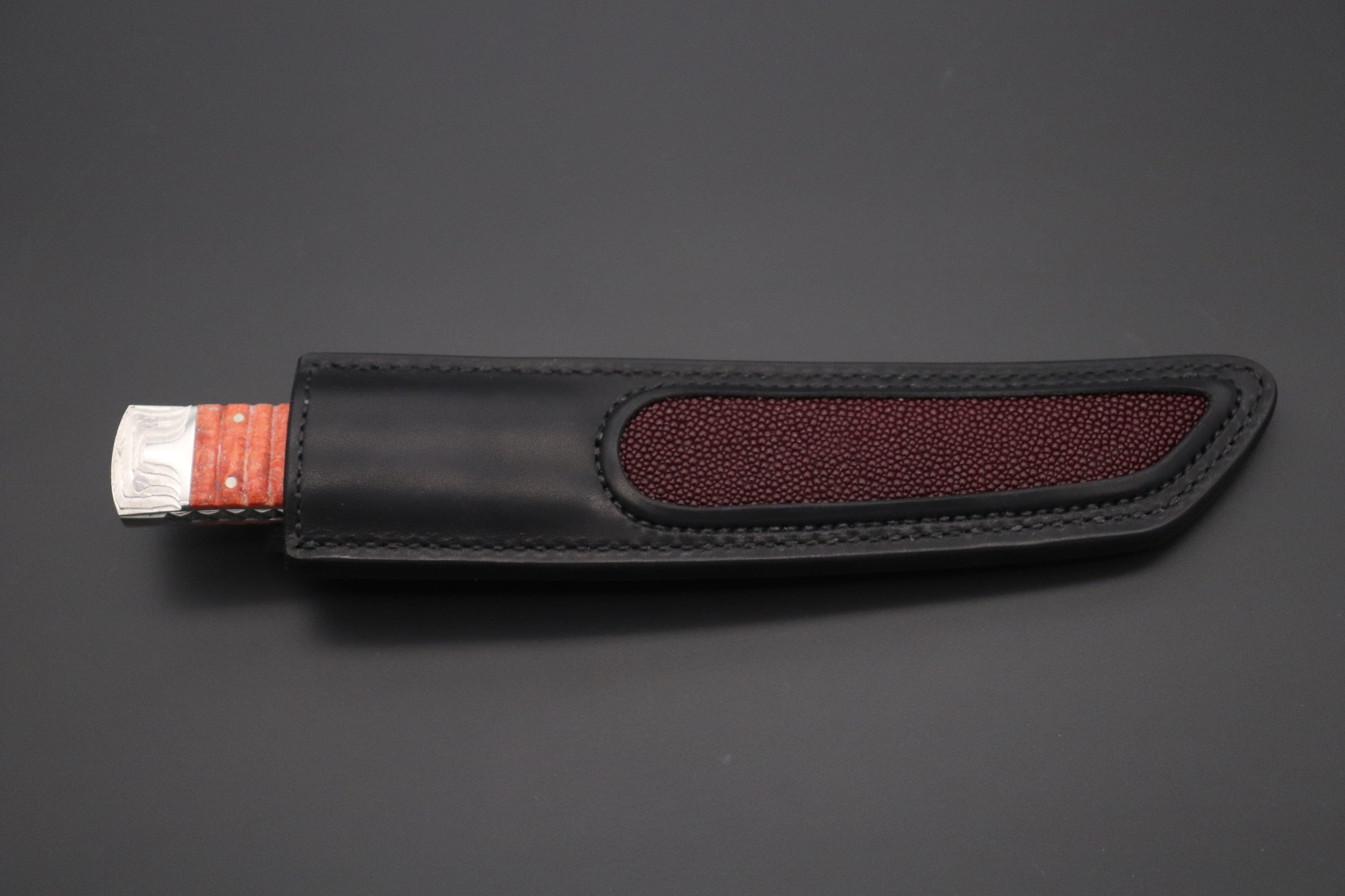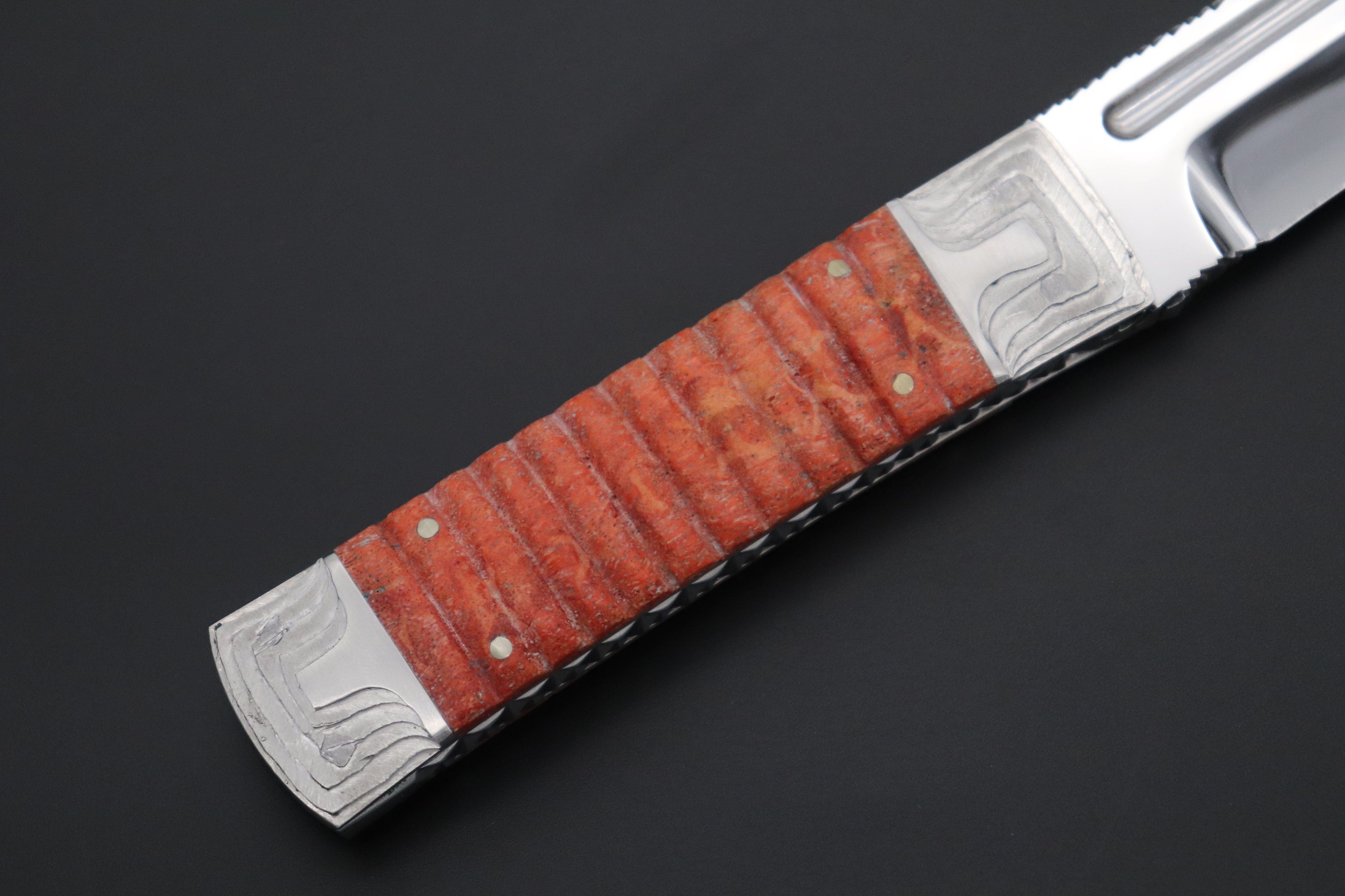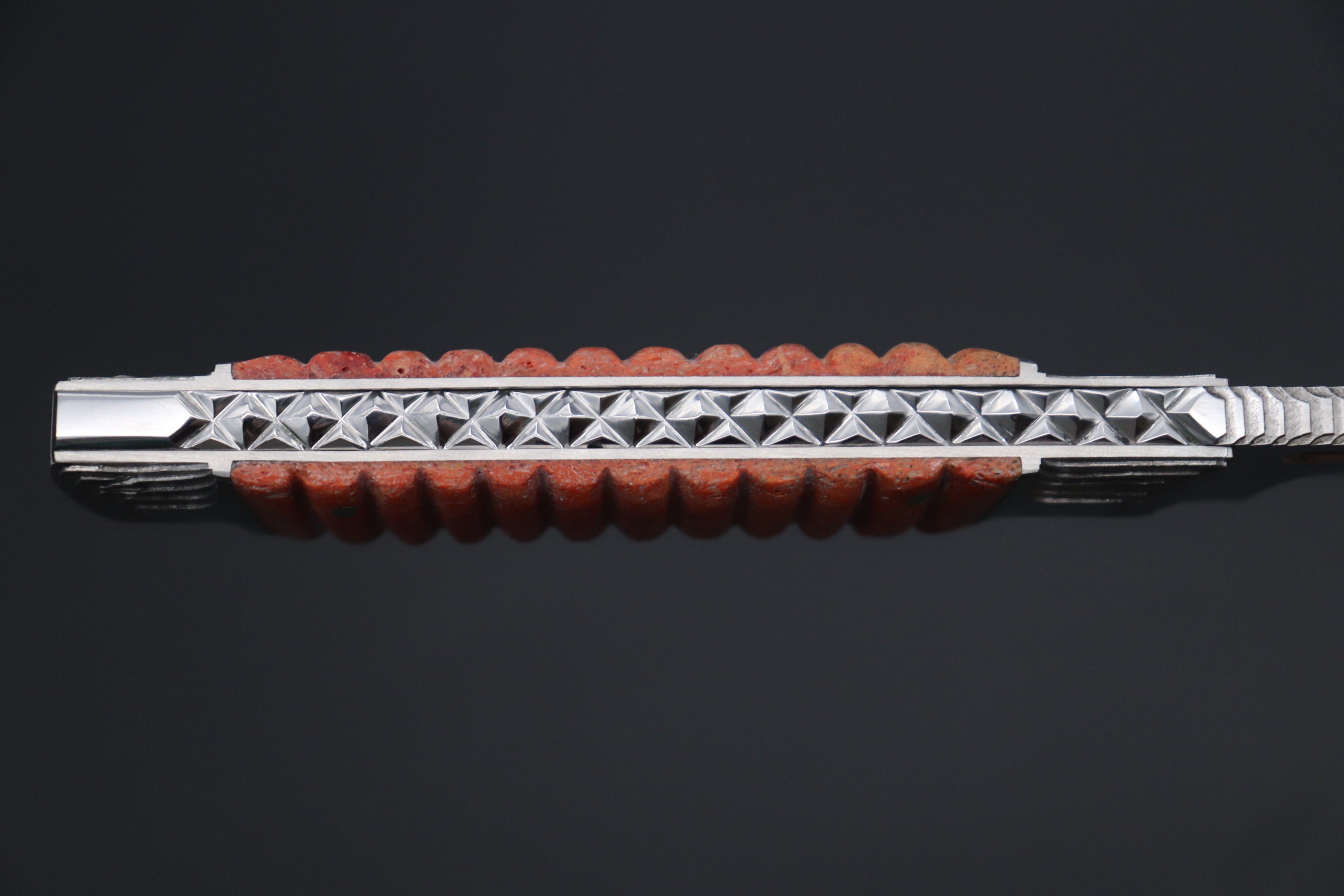The blade, made from Solid Cowry X Powdered High-Speed Tool Steel (HRC 63), is a prime example of the Japanese traditional Tanto blade. Perfectly Mirror Polished Cowry X Mono-Steel has 6mm Spine thickness, which makes sense of solidity and sturdiness. The graceful, flowing curves of the upswept and dynamic Tanto blade harmonize a powerful edge with elegant lines. The Hilt and Butt feature 316 stainless steel elements carved with Air Step Design and technique. The Main Handle Material is made from distinctive Red Coral which brings the natural and traditional modern taste for Koji's Tanto.