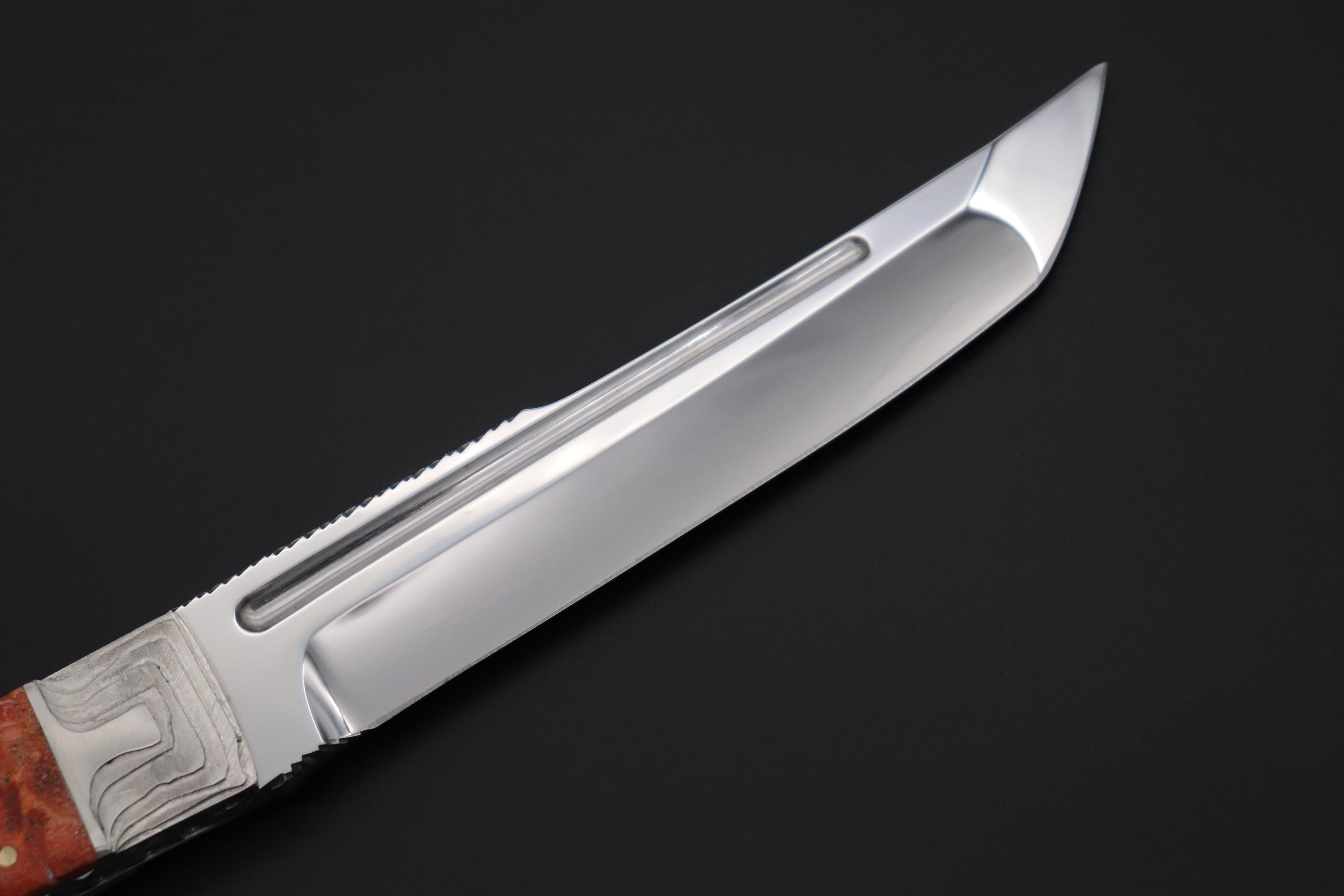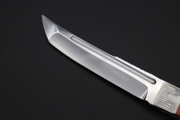 In 1998, Custom Knife Maker Koji Hara received the "Most Innovative Design" Award at the prestigious East Coast Custom Knife Show in New York, recognizing his groundbreaking work on a custom folding knife featuring his original "Air Step" technique. This award marked a significant milestone in Koji Hara's career, as it brought international recognition to his unique design philosophy and exceptional craftsmanship. The "Air Step" technique—Koji Hara’s signature innovation—involves meticulously carving the handle material in layered steps to create a striking three-dimensional effect. This approach not only enhances the visual elegance of each knife but also demonstrates a seamless fusion of function and artistry, qualities that define Koji Hara’s most celebrated works.