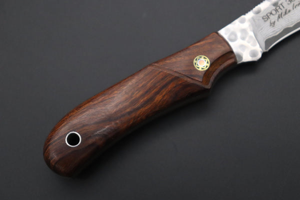The blade is made from VG-10 Damascus Stainless Steel, features a Matte Gray Finish with a traditional hammered texture (tsuchime) for a striking look. Just like Mike Irie’s originals, the blade has fine jimping on the spine for grip and control.
