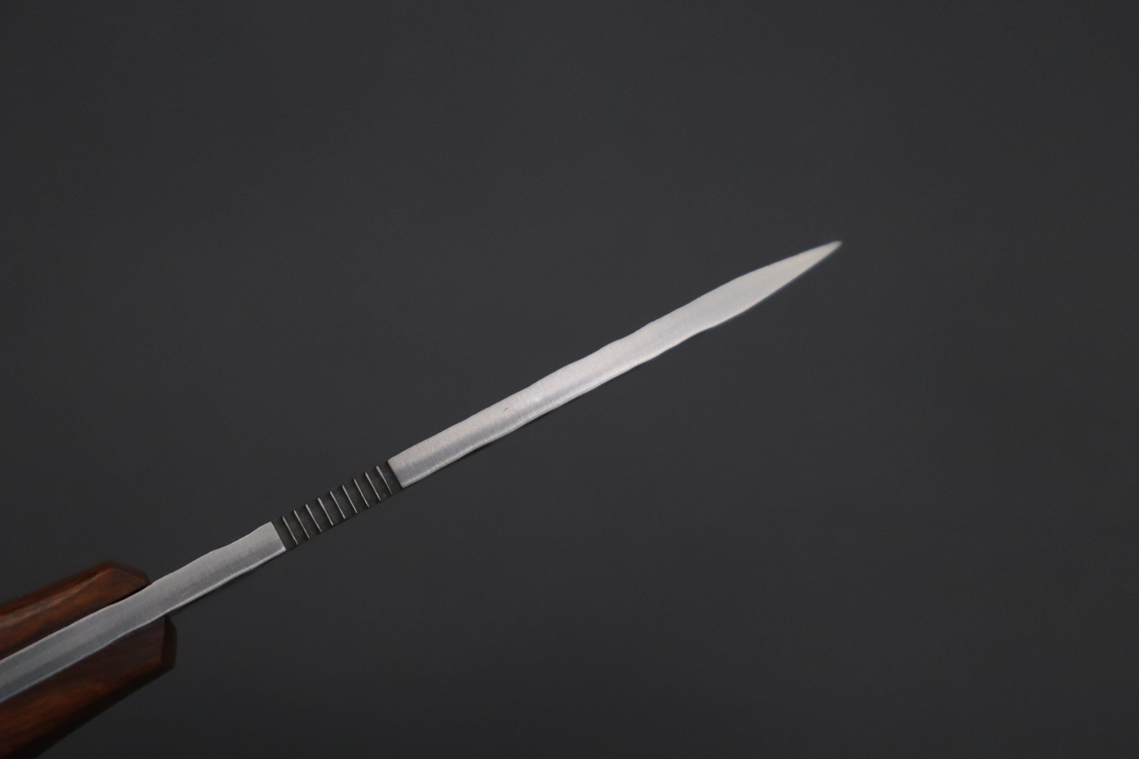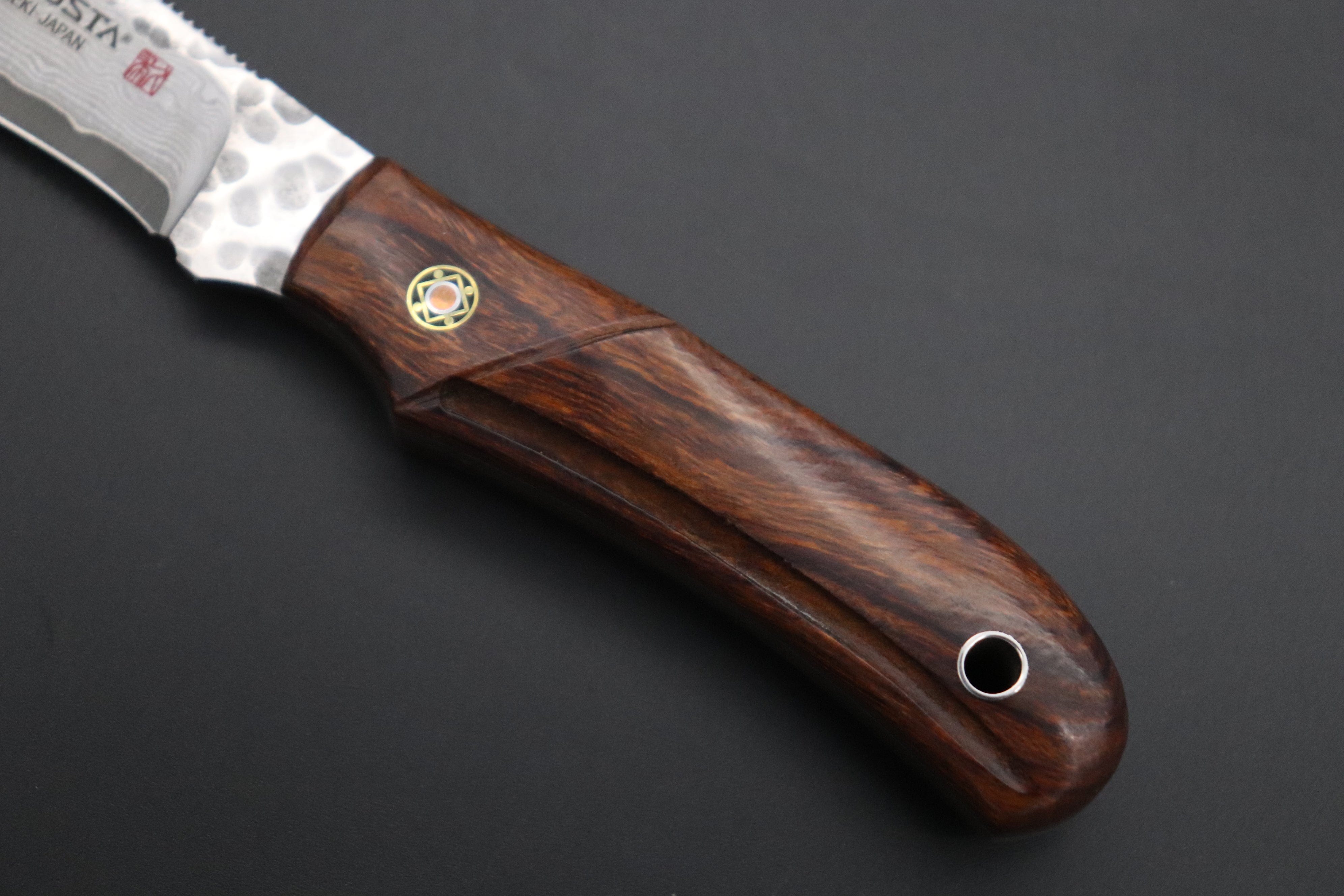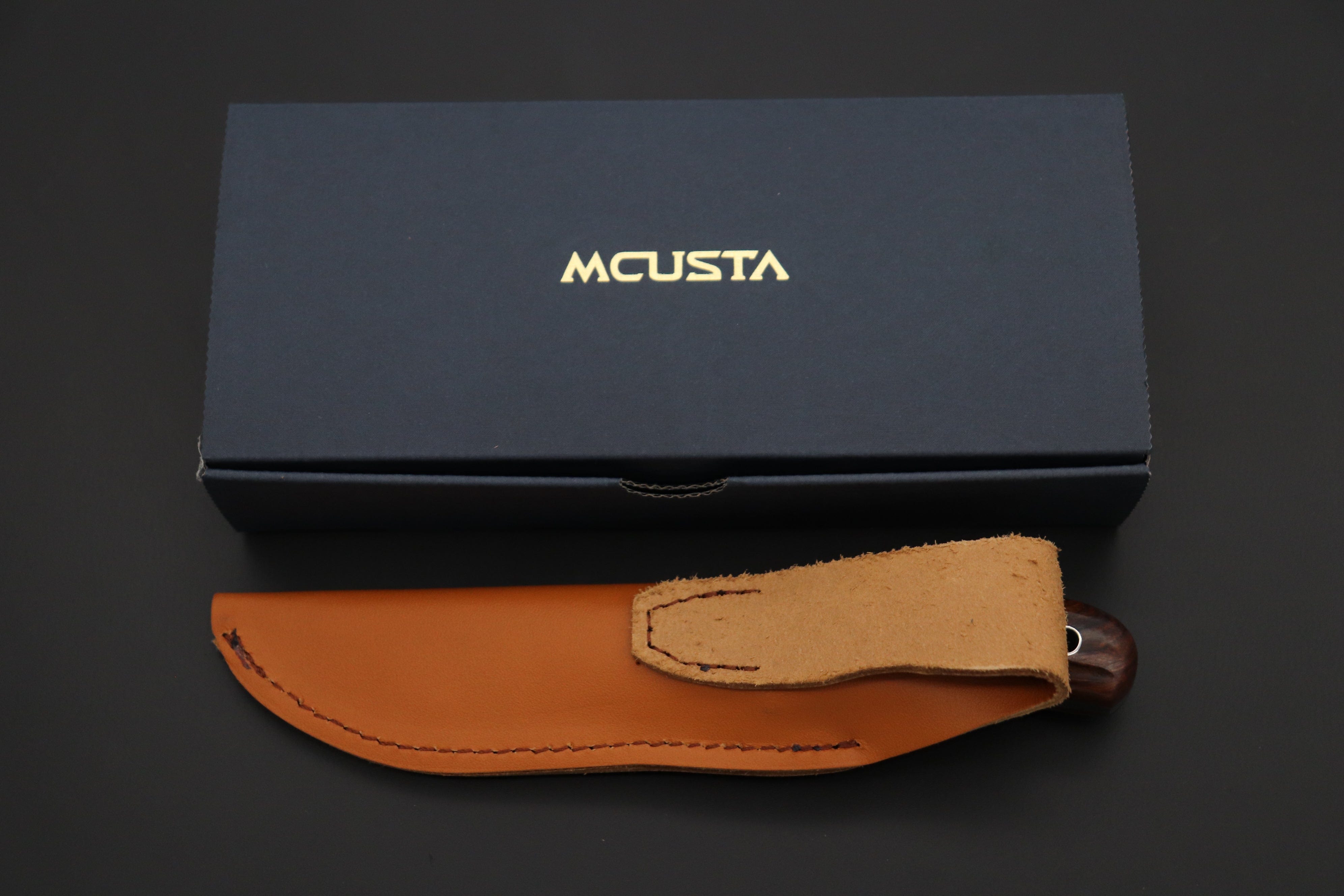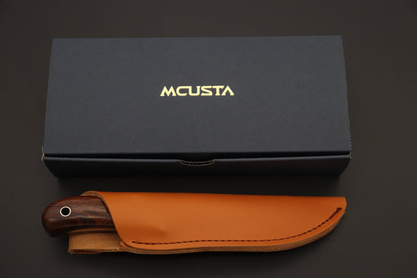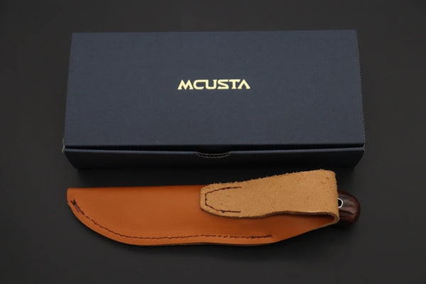 The handle is made of contoured Desert Ironwood with precise and elegant grooves—true to Mcusta’s refined style. It’s comfortable in hand, balanced, and built for practical use. This knife comes with a Brown Leather Sheath.