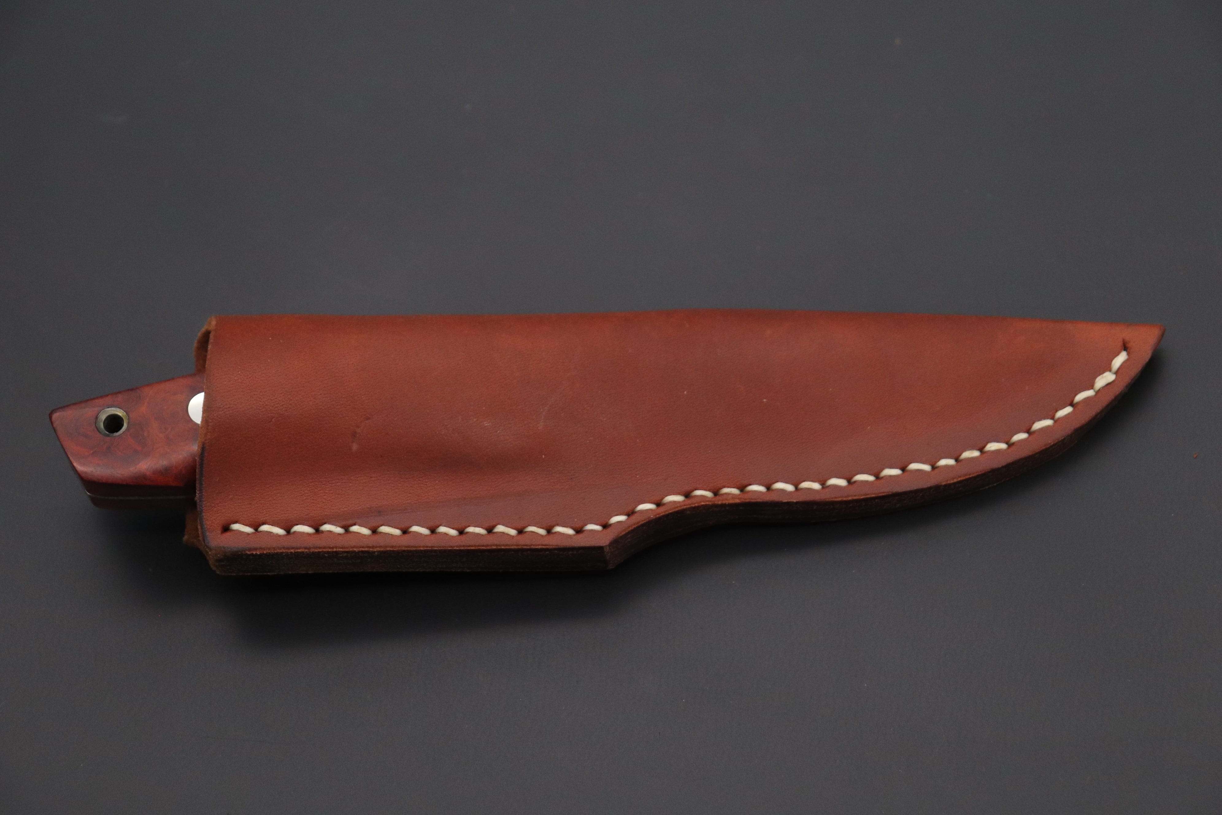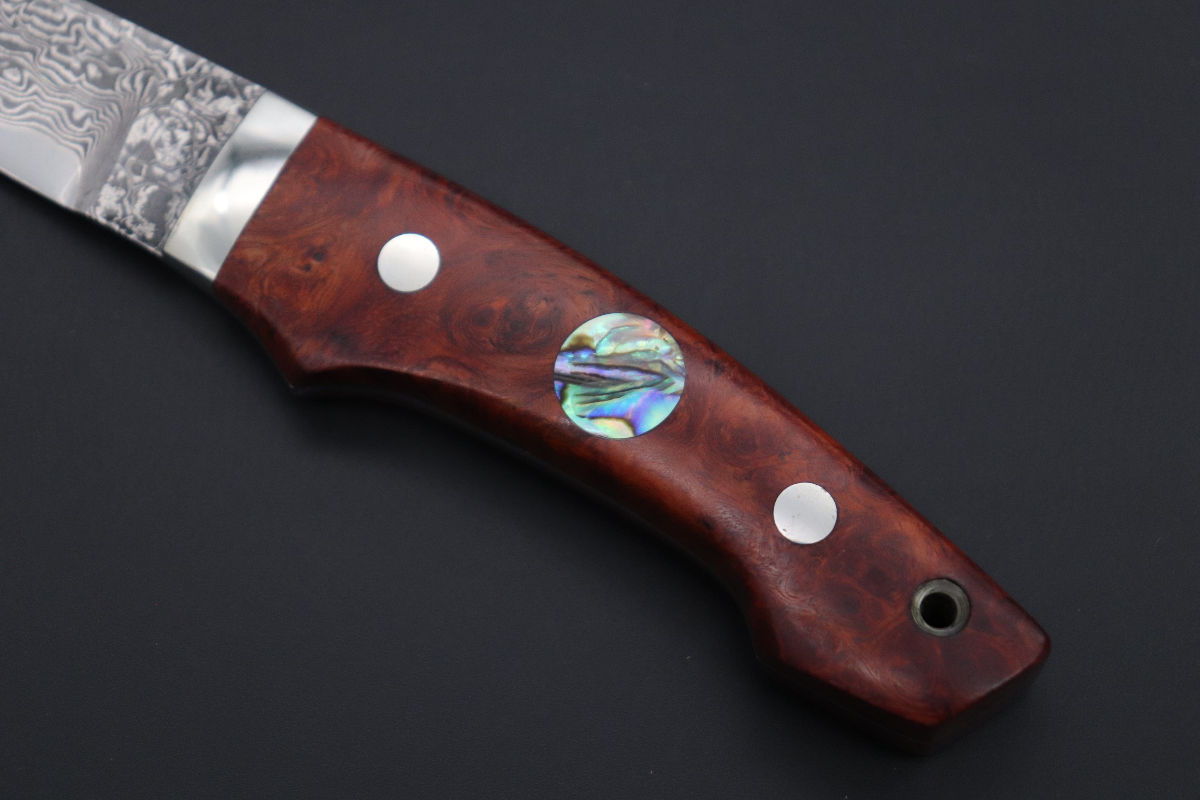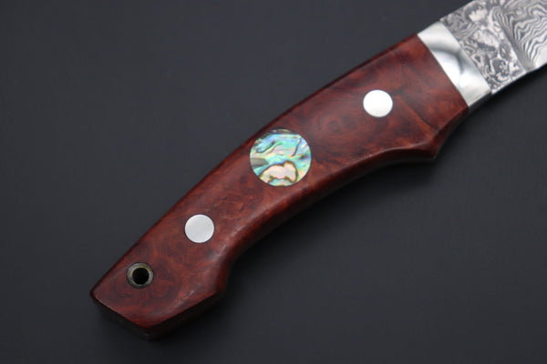IT-960 Drop Point Utility Hunter features 3.7 Drop point R-2 Damascus blade, 4.4" Hand contoured Quince Burlwood handle with Abalone inlay,  Nickel silver Hilt and Rivets. Full tapered tang with stainless tubular lanyard hole on end, Comes with handcrafted Leather sheath with belt loop.