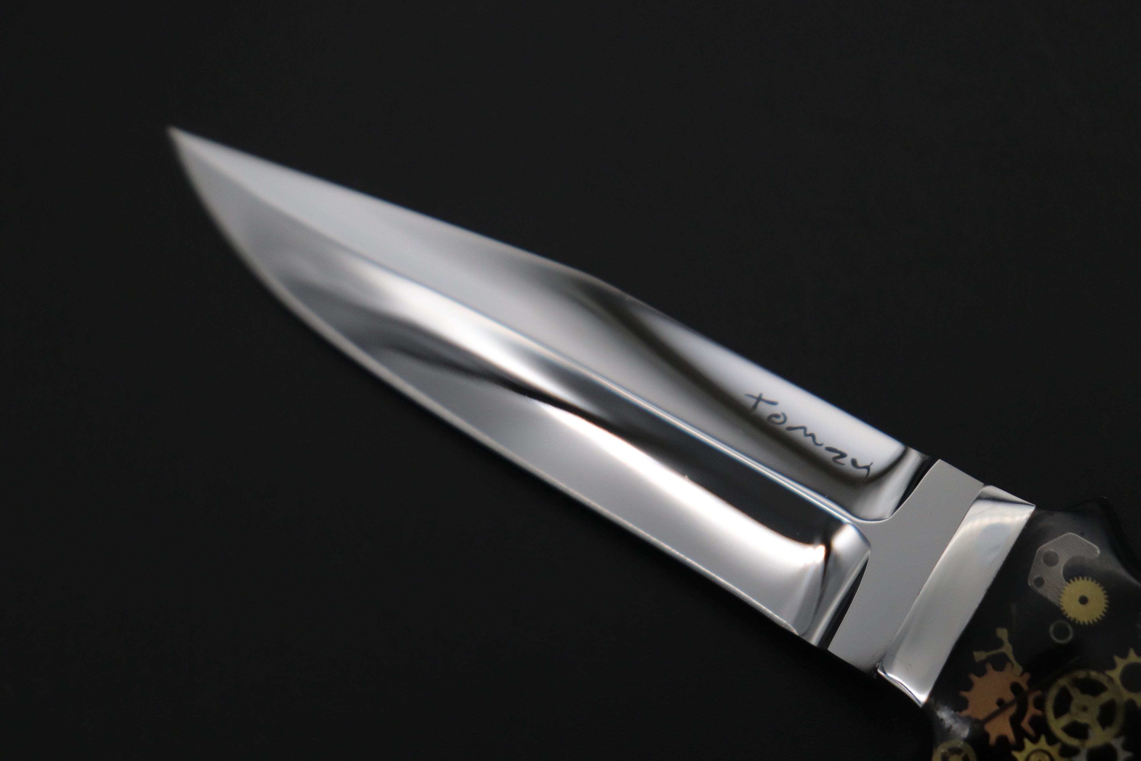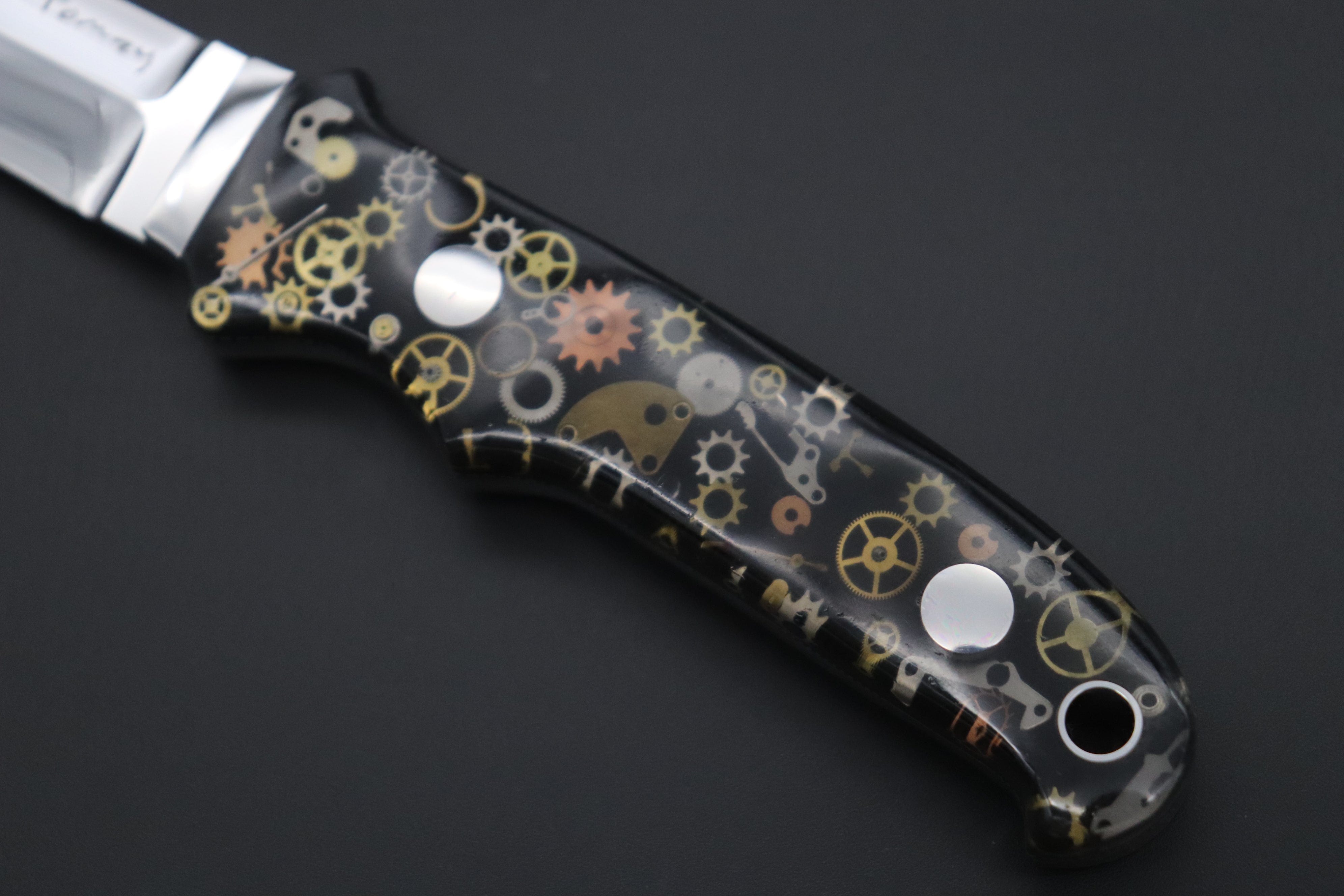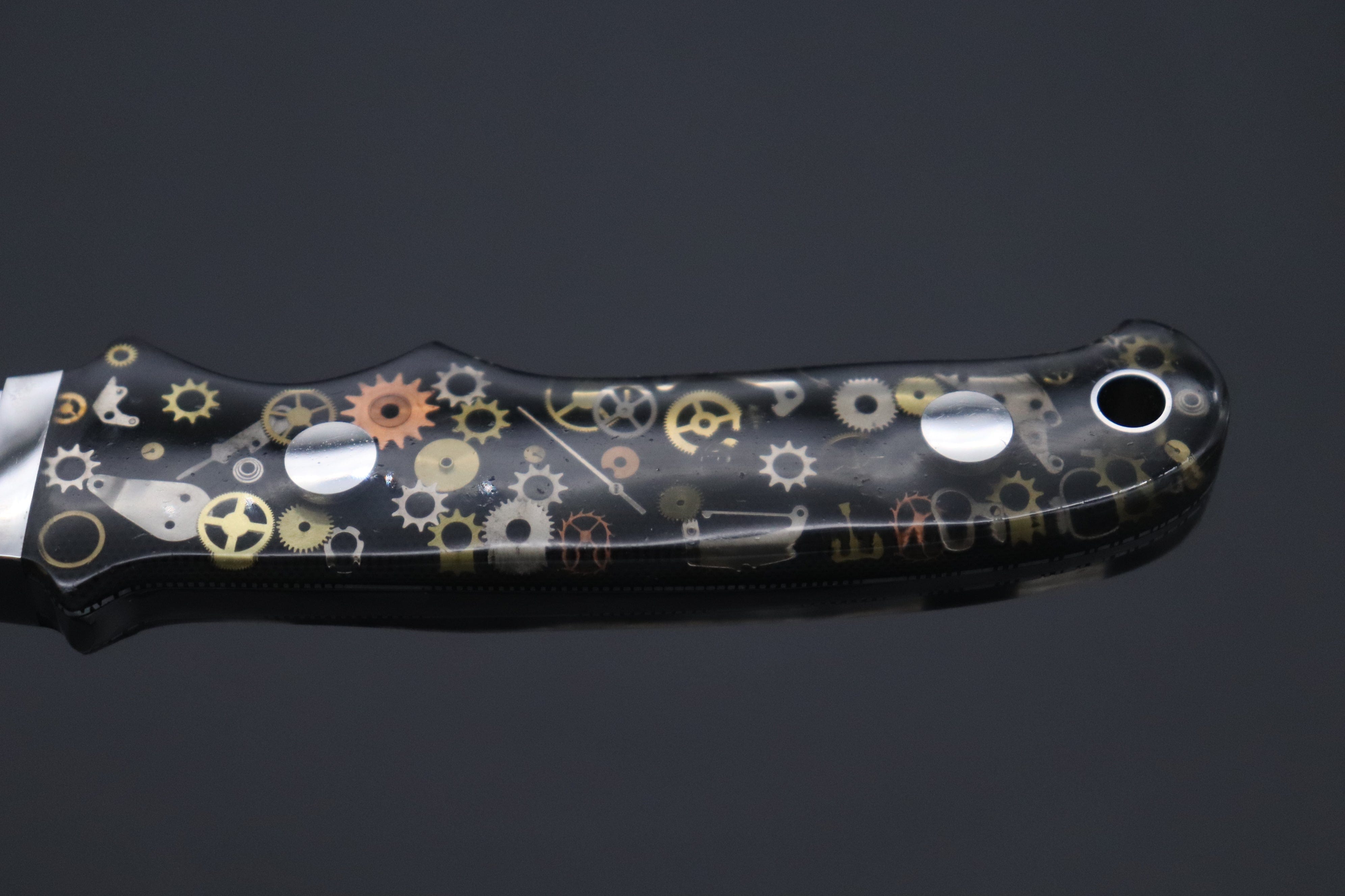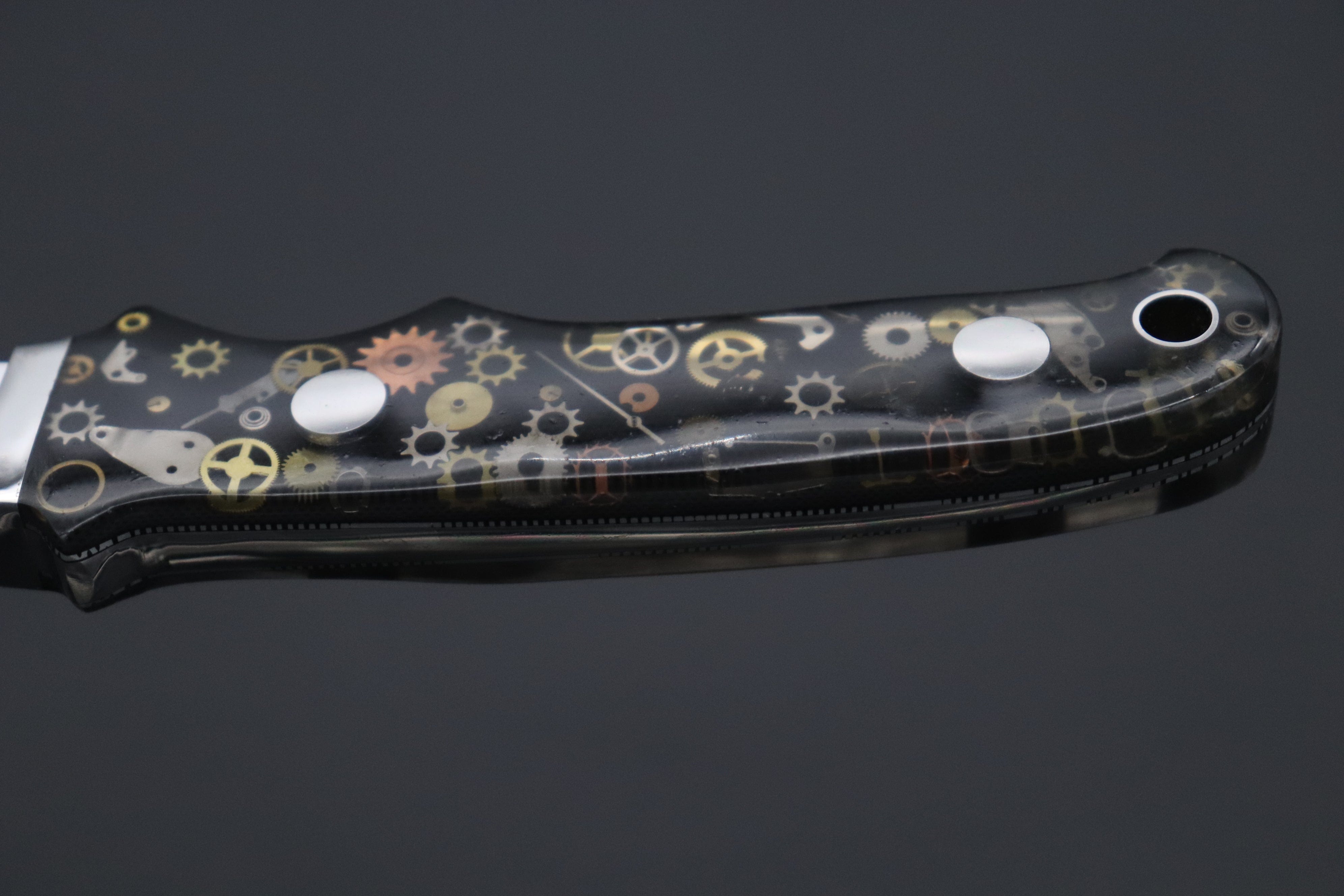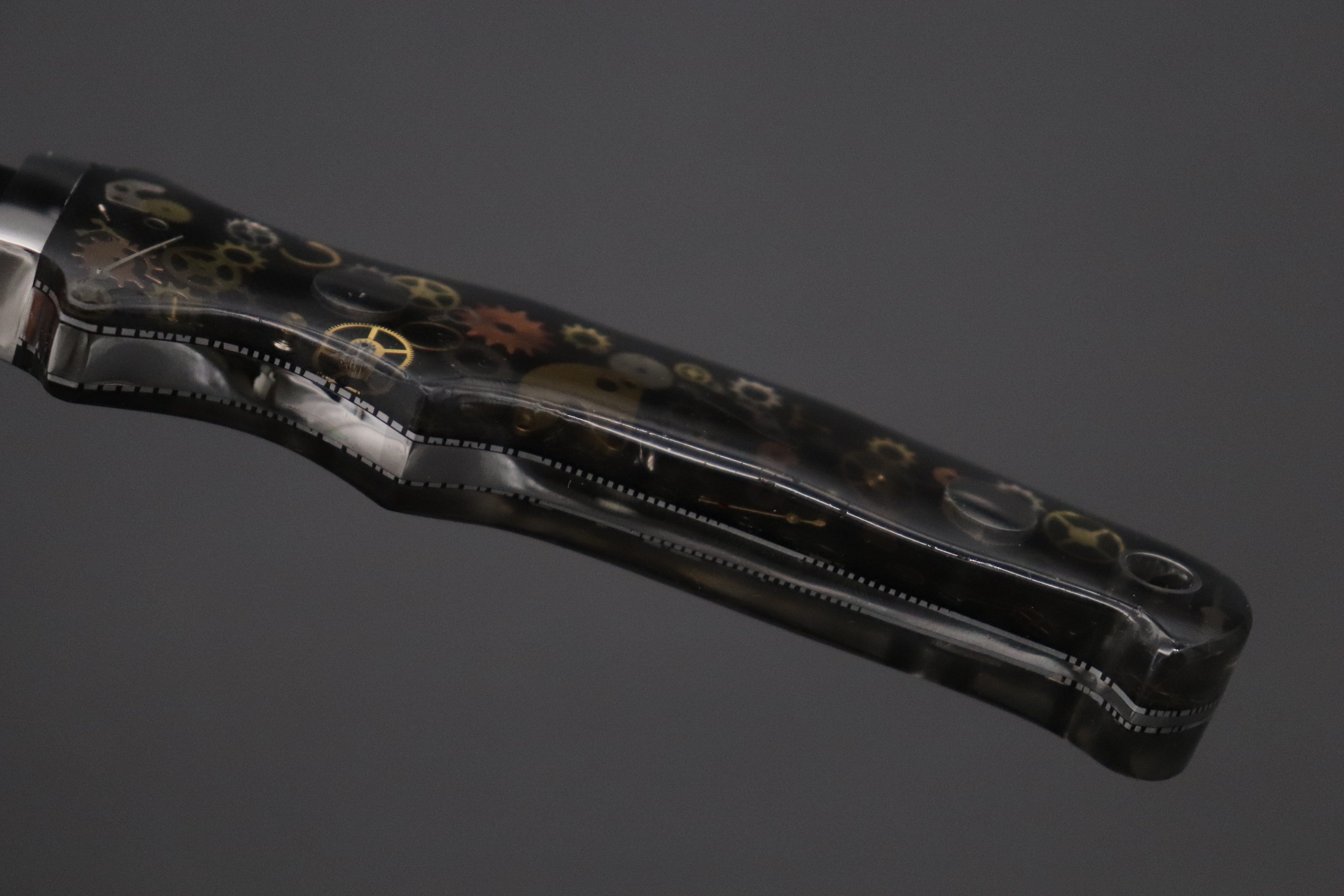 He pays special attention when selecting many of the watch parts and crafting his original dream knife. His handmade Custom Resin Handle can be viewed from a variety of angles, with each view providing a uniquely beautiful and exciting scene. This predominantly black color hybrid handle highlights the intricate details, three-dimensional quality, and artistic essence of the watch components. Meanwhile, the beautifully polished silver-colored knife blade and hilt complement each other perfectly, resulting in a magnificent piece of art.