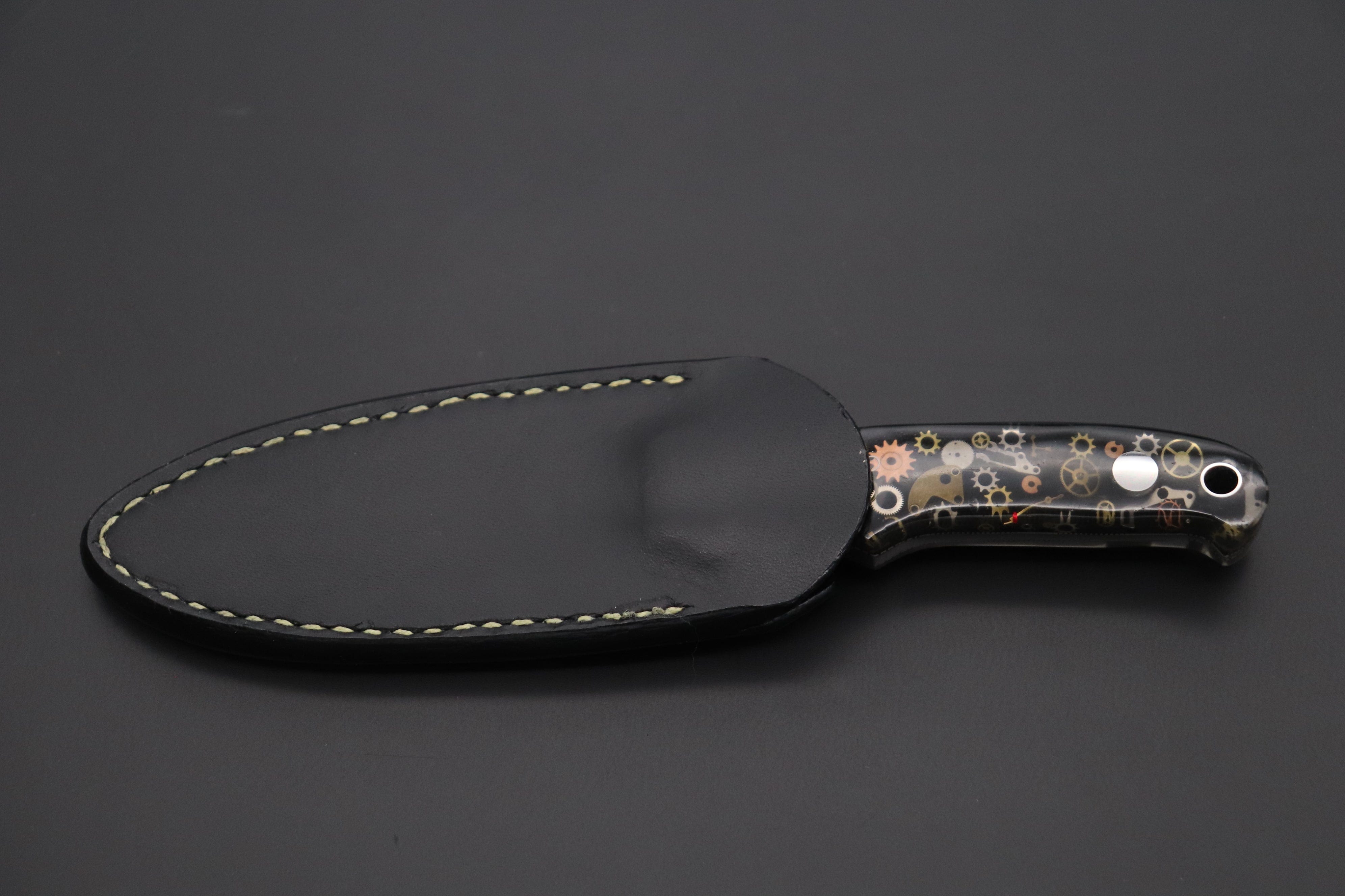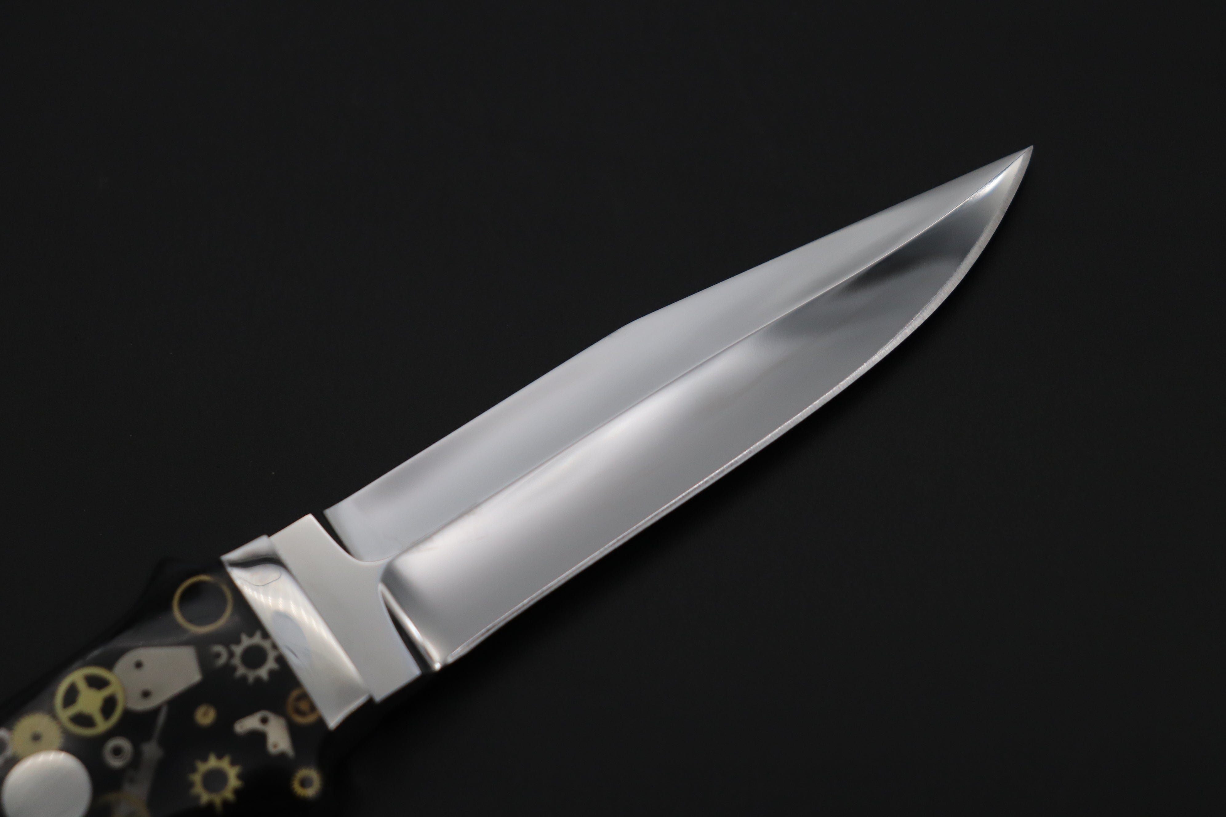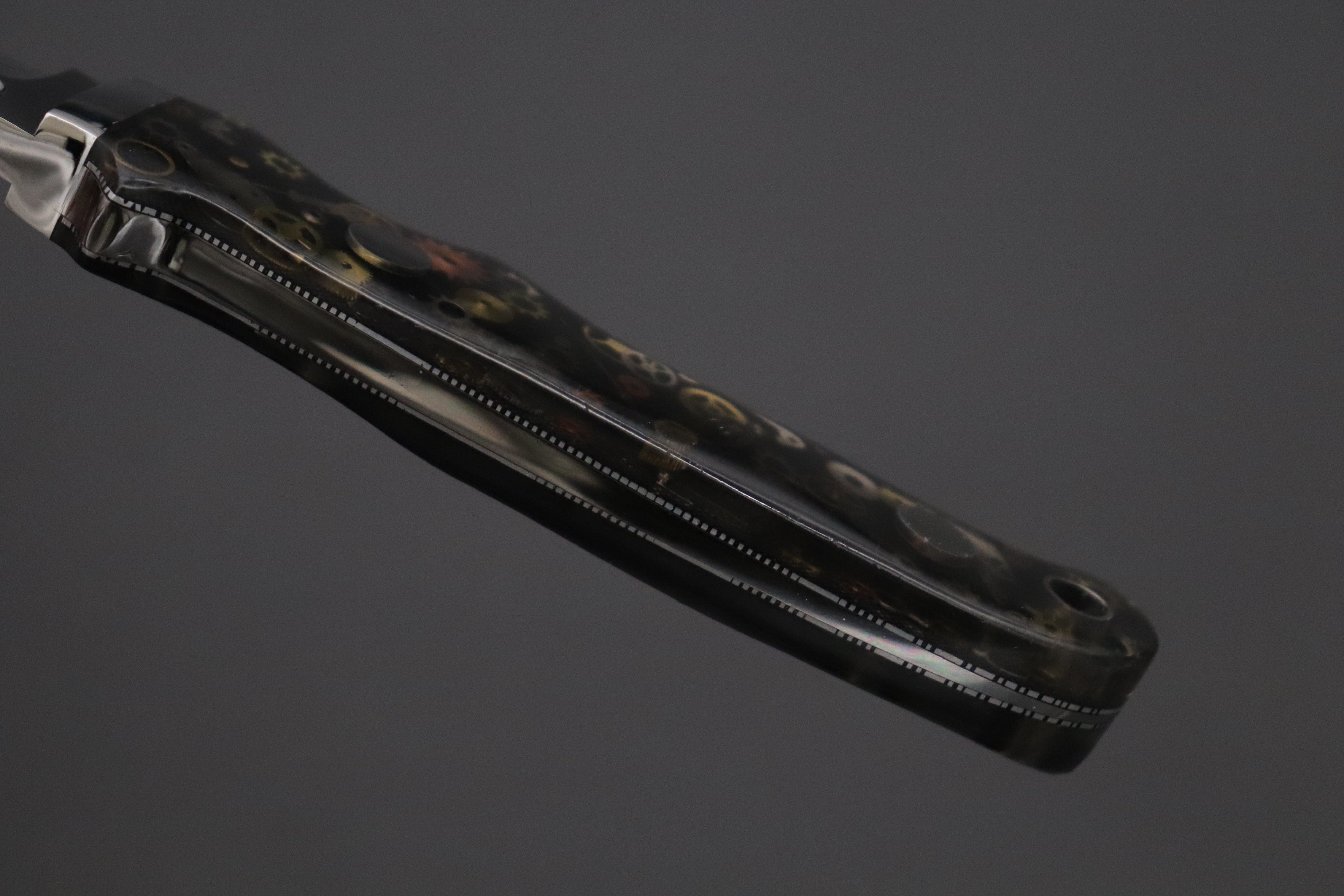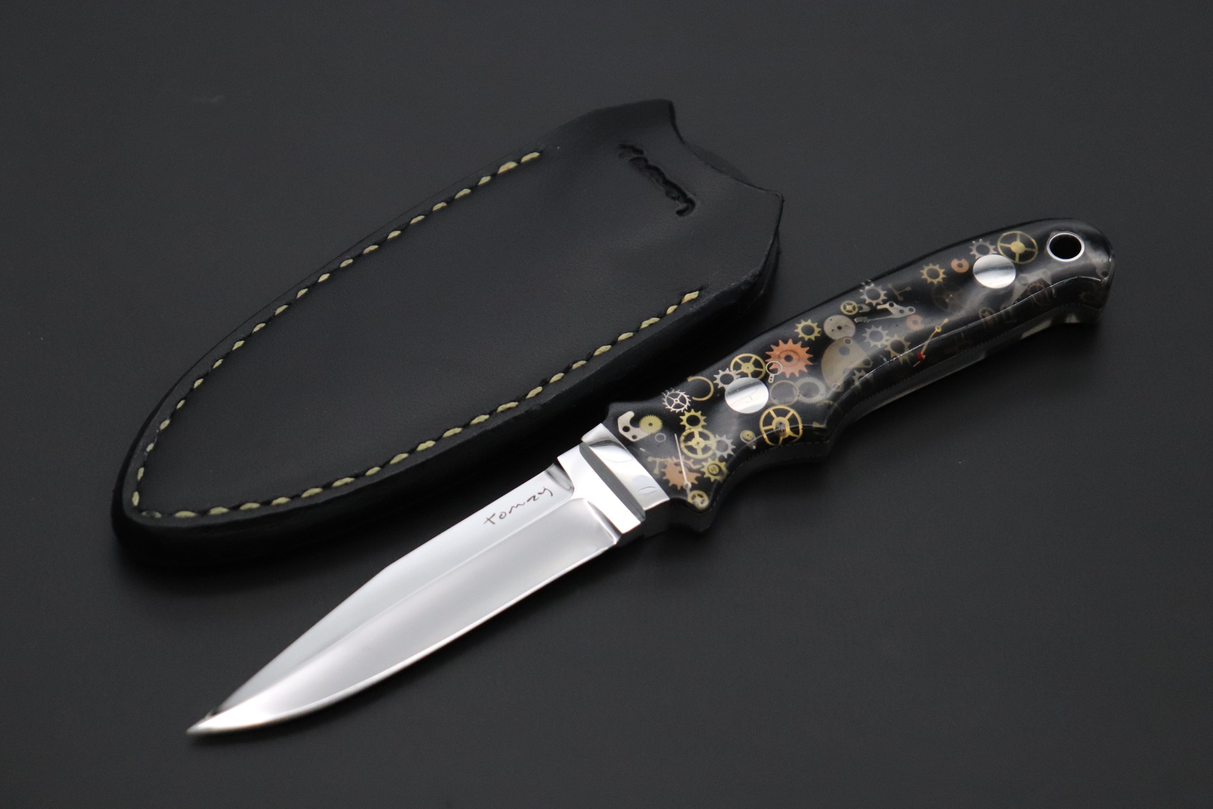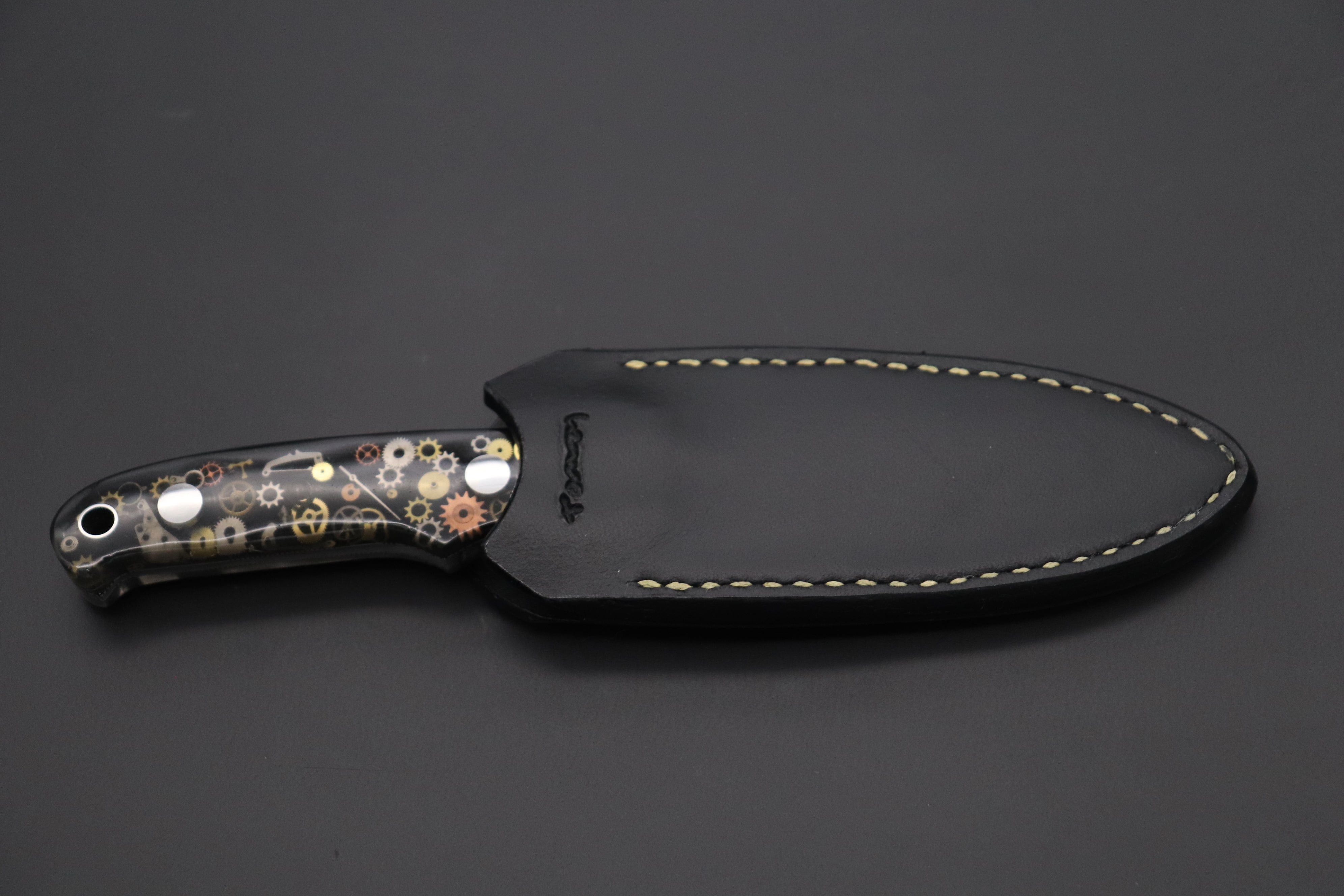 He pays special attention when selecting many of the watch parts and crafting his original dream knife. His handmade Custom Resin Handle can be viewed from a variety of angles, with each view providing a uniquely beautiful and exciting scene. This predominantly black color hybrid handle highlights the intricate details, three-dimensional quality, and artistic essence of the watch components. Meanwhile, the beautifully polished silver-colored knife blade and hilt complement each other perfectly, resulting in a magnificent piece of art.